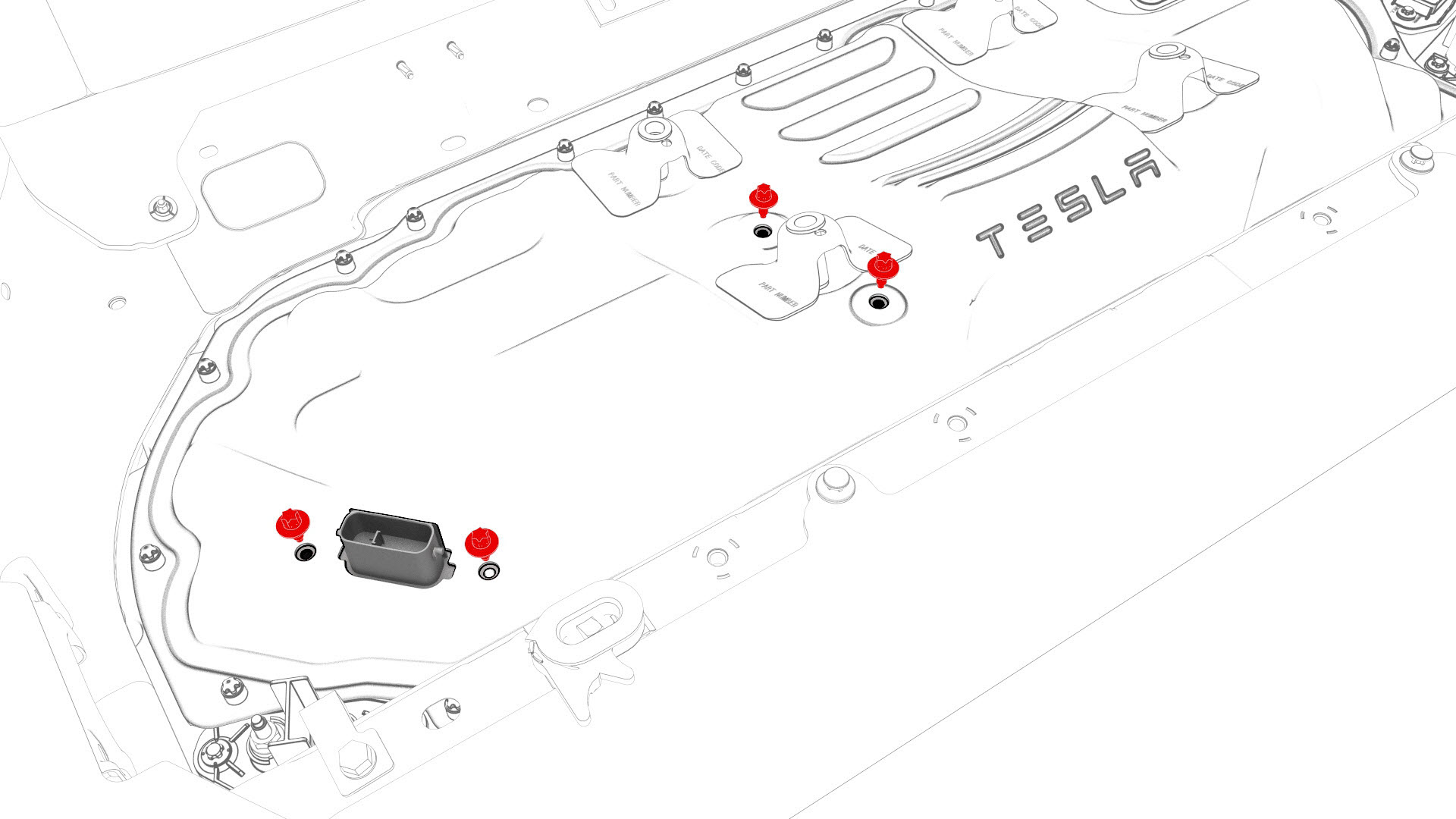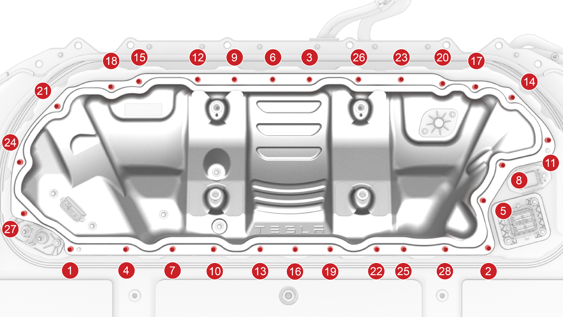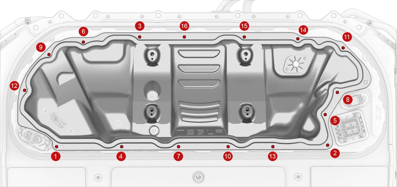 ![]() | 5 | Install the penthouse cover on the HV battery, and then hand-tighten the bolts. Note: Different penthouse cover revisions have 28, 18, or 16 bolts.