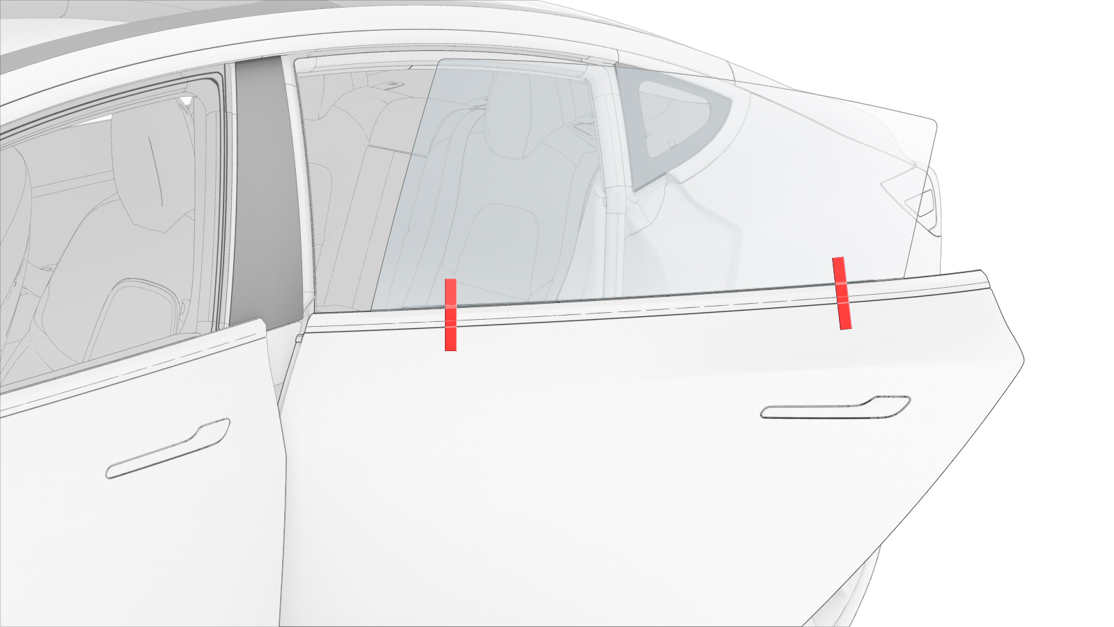 ![]() | 2 | Place 2 pieces of masking tape vertically over the rear LH door glass and outer belt. | |