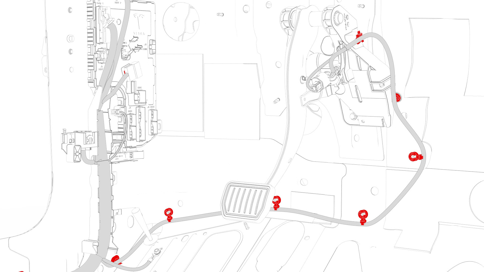 ![]() | 16 | Fasten the clips that attach the electrical harness to the body under the front LH seat and RH lower B-pillar areas. | |