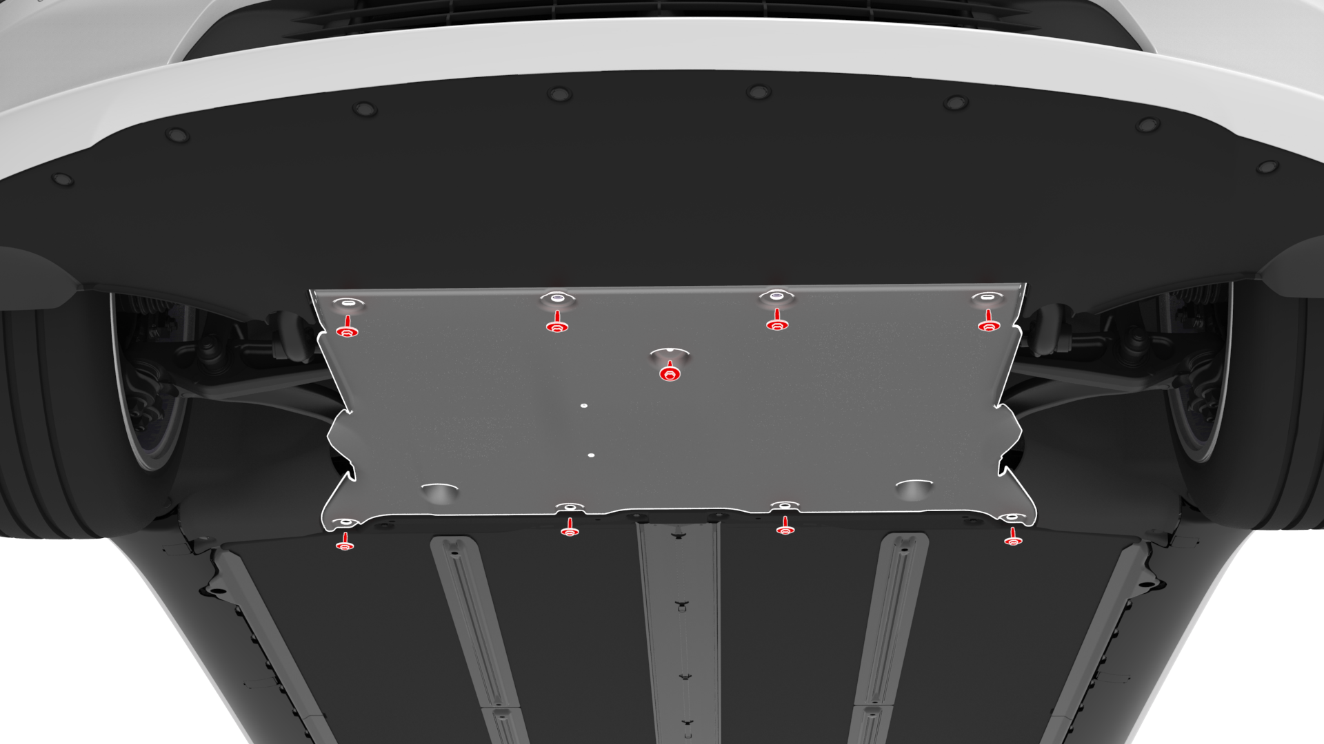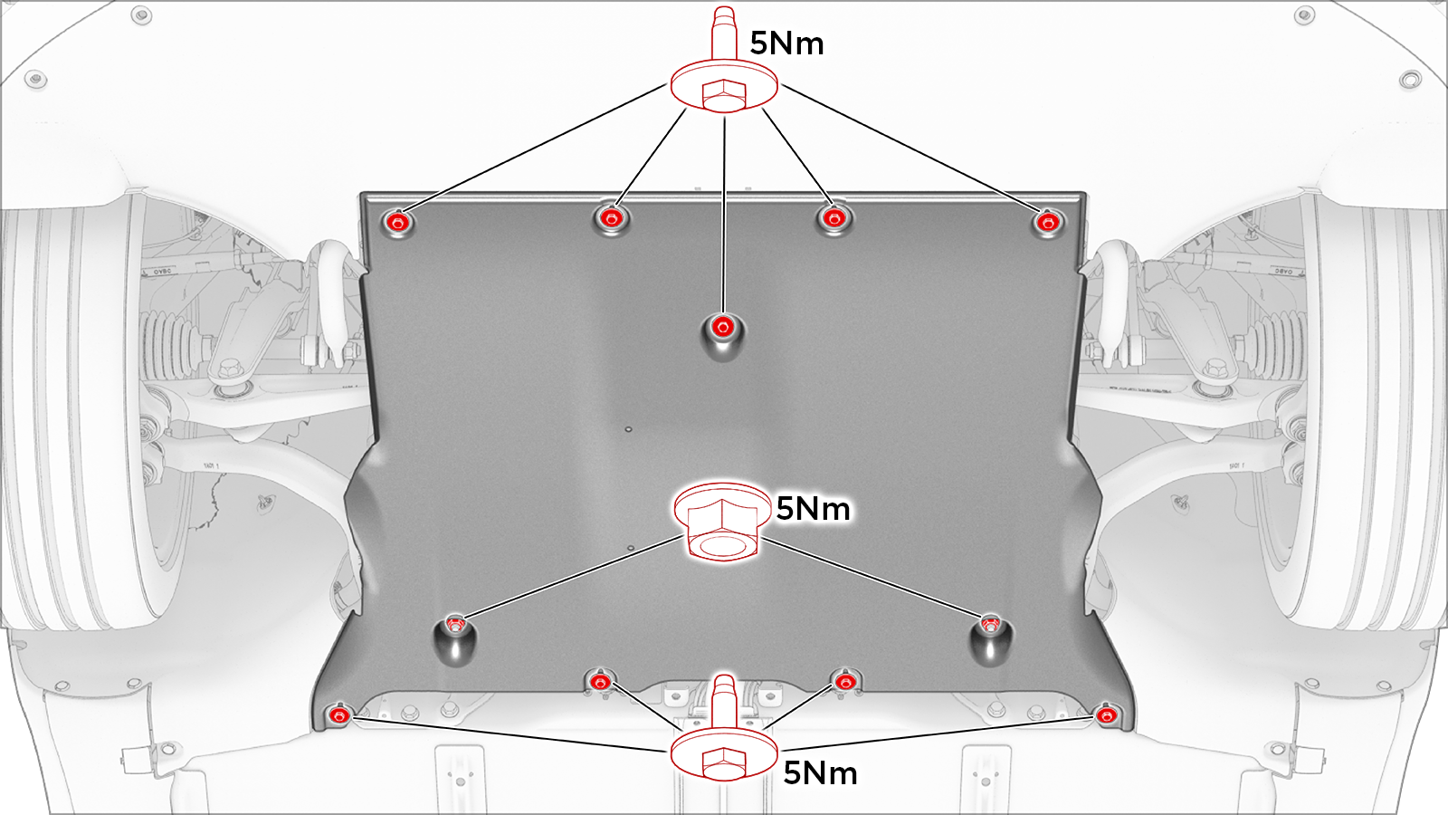 ![]() | 3 | Hand-tighten the bolts (x9) that attach the front aero shield panel to the vehicle. | |