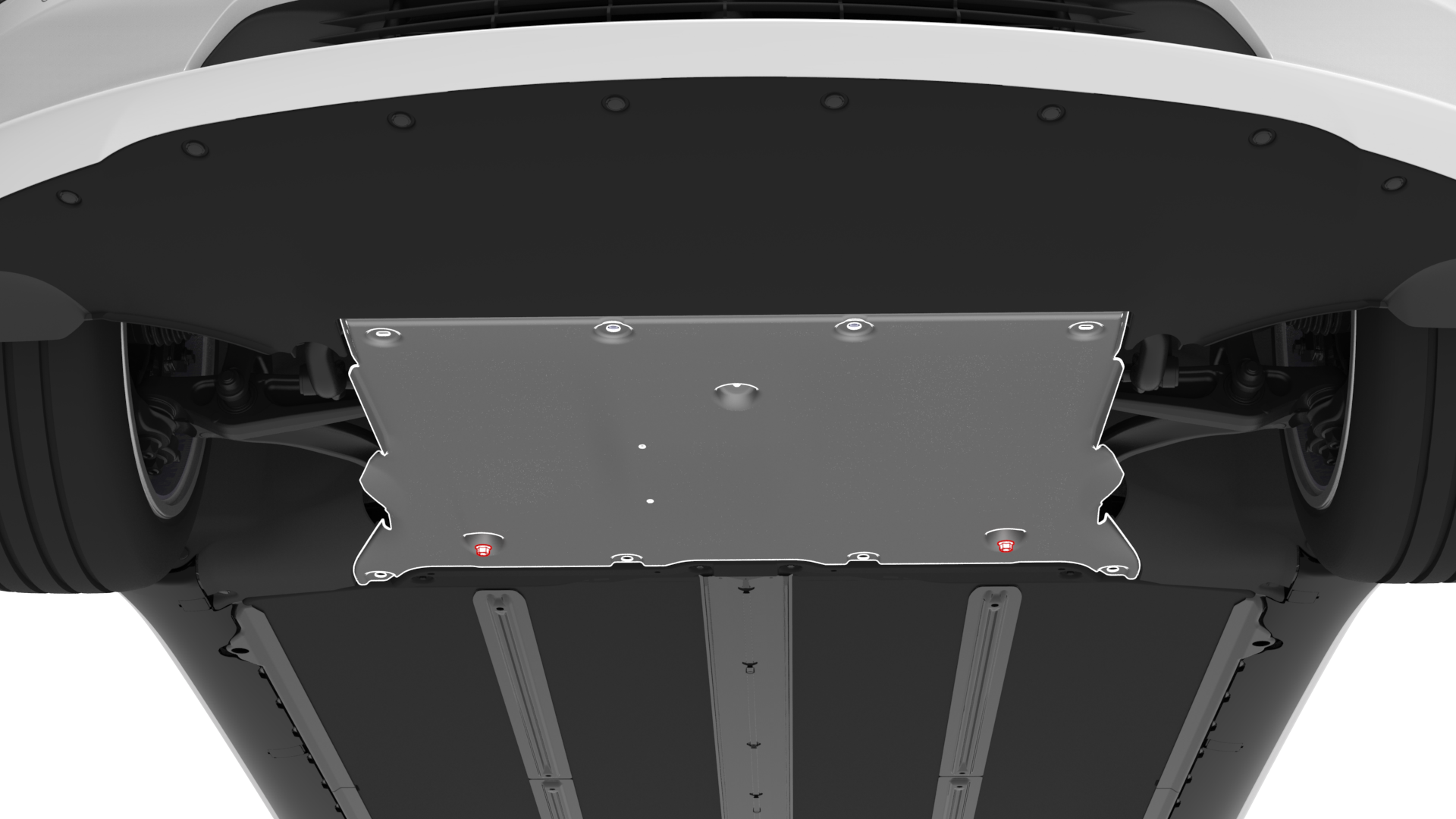 ![]() | 2 | Install the front aero shield panel to the underside of the vehicle, and then hand-tighten the nuts (x2) to temporarily hold the panel in place. | |