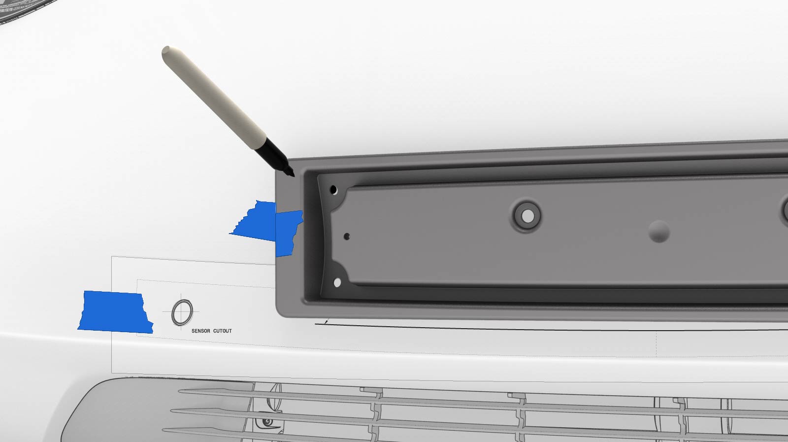 RH side ![]() LH side ![]() | 5 | Paint the top 2 bracket holes on the front fascia with a paint marker; use the pilot holes to mount the front license plate bracket. The bottom holes cover the template. Note: The template must be removed before fastening the front license plate bracket to the front fascia.