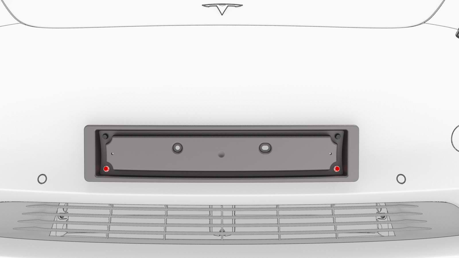 ![]() | 9 | Install the 2 top screws (part number 1104972-00-A) that attach the front license plate bracket to the front fascia.![]() Torque 1 Nm | |