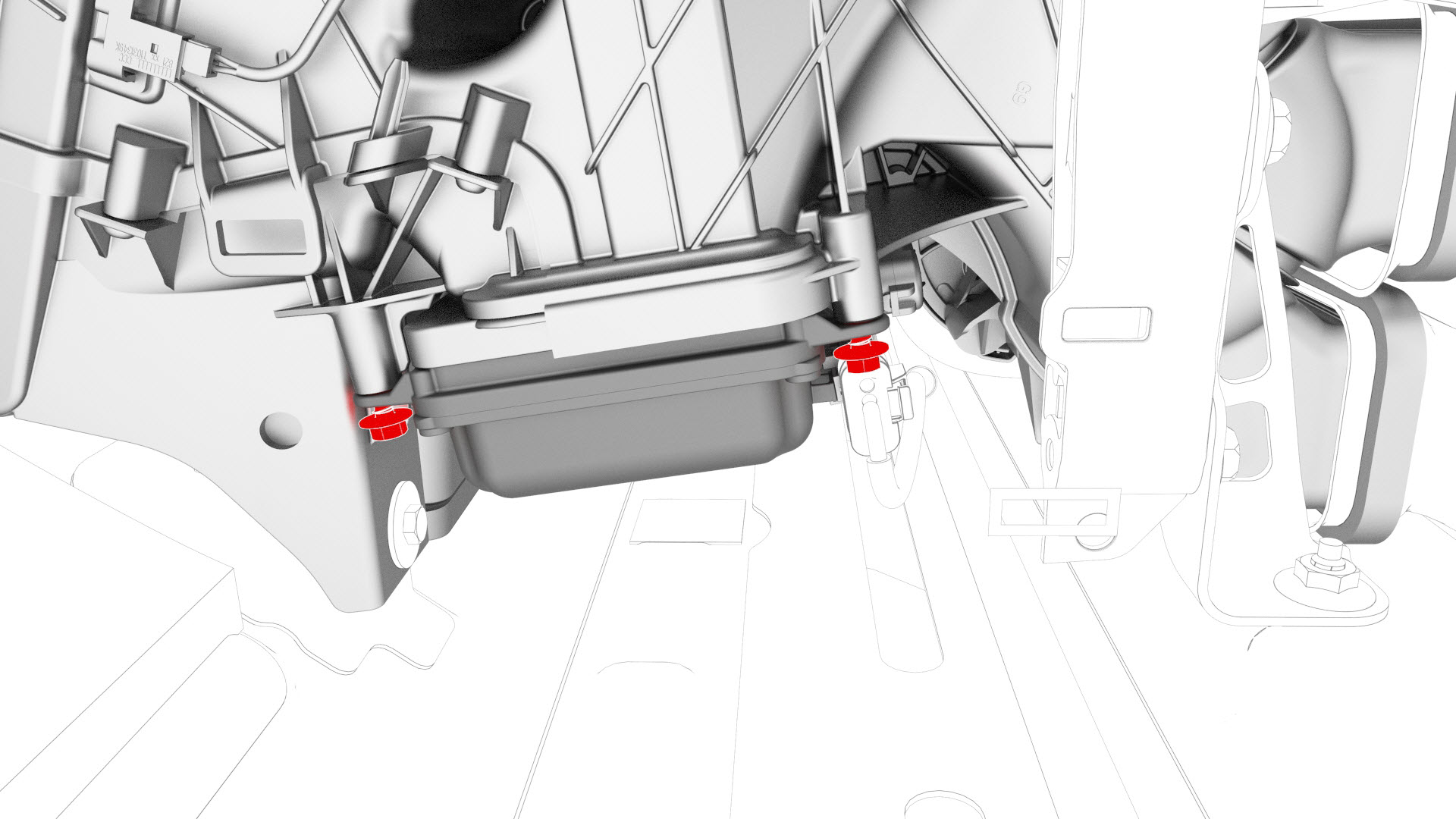 ![]() | 4 | Position the new airbox side cover for installation, and then install the bolts that attach the airbox side cover to the HVAC assembly.![]() Torque 1.2 Nm | |