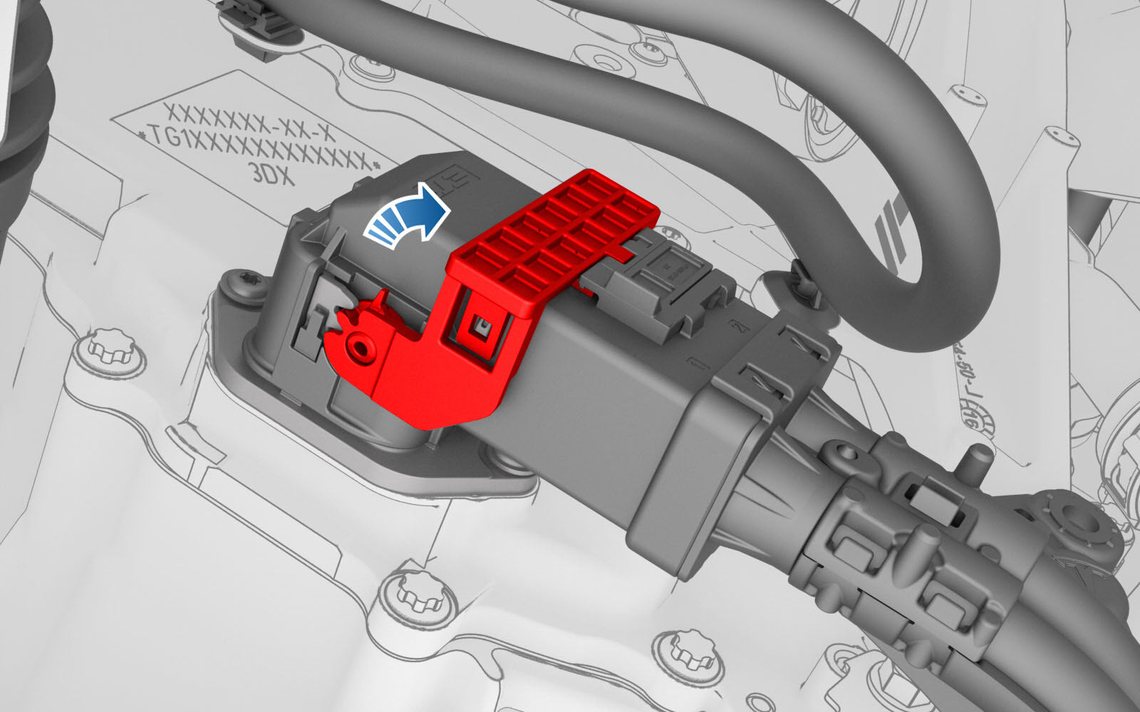 ![]() | 90 | Connect the front drive unit harness connector to the front drive unit. Note: Make sure the connector is fully seated, and that the front drive unit alignment tooth makes contact with the front drive unit harness connector lever.