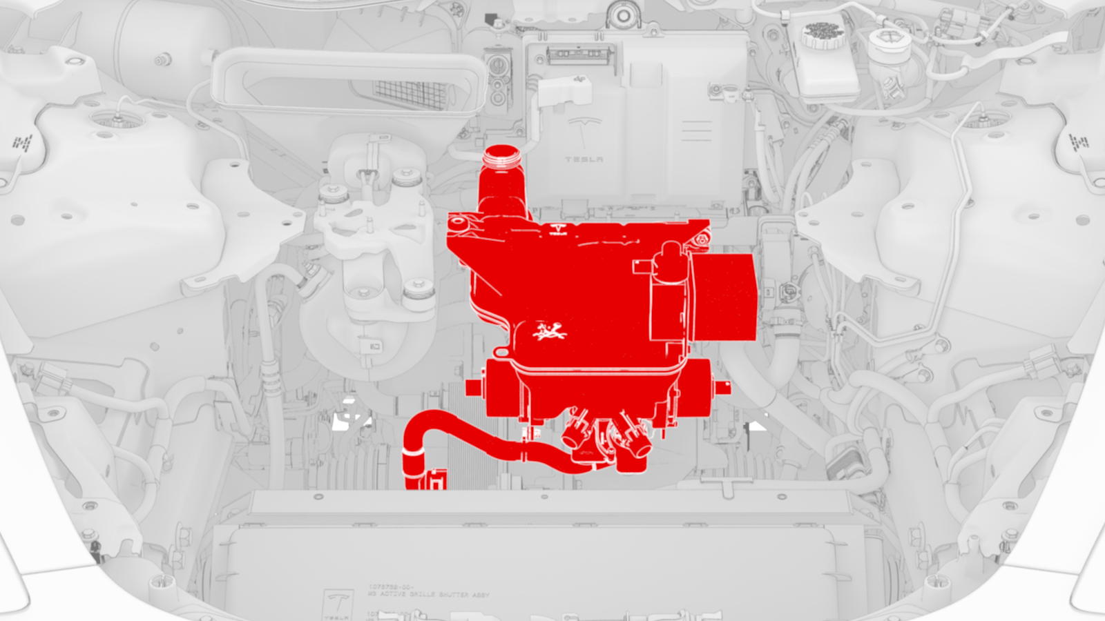 ![]() | 12 | Install a foldable funnel underneath the heat exchanger, as shown. Note: Make sure the foldable funnel covers the front drive unit 12V connector, steering rack, and is positioned to catch fluid from the heat exchanger coolant outlet.