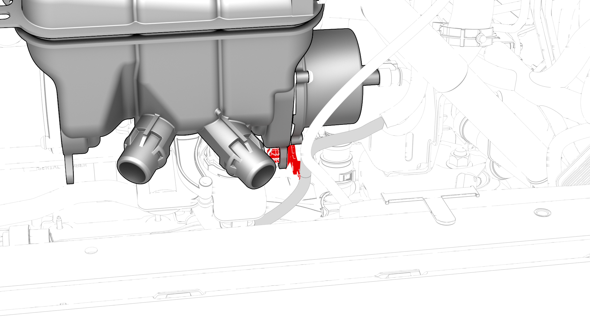 ![]() | 21 | Disconnect the electrical harness from the powertrain pump to sill hose coolant temperature sensor connector. Tip: Tilt the superbottle toward the front of the vehicle for better access. | |