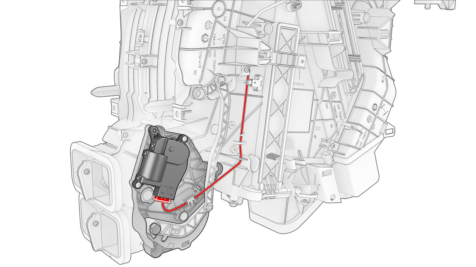 | 1 | Position the lower mode actuator on the HVAC assembly; align the guide, and then push the lower mode actuator towards the left to install. | ||