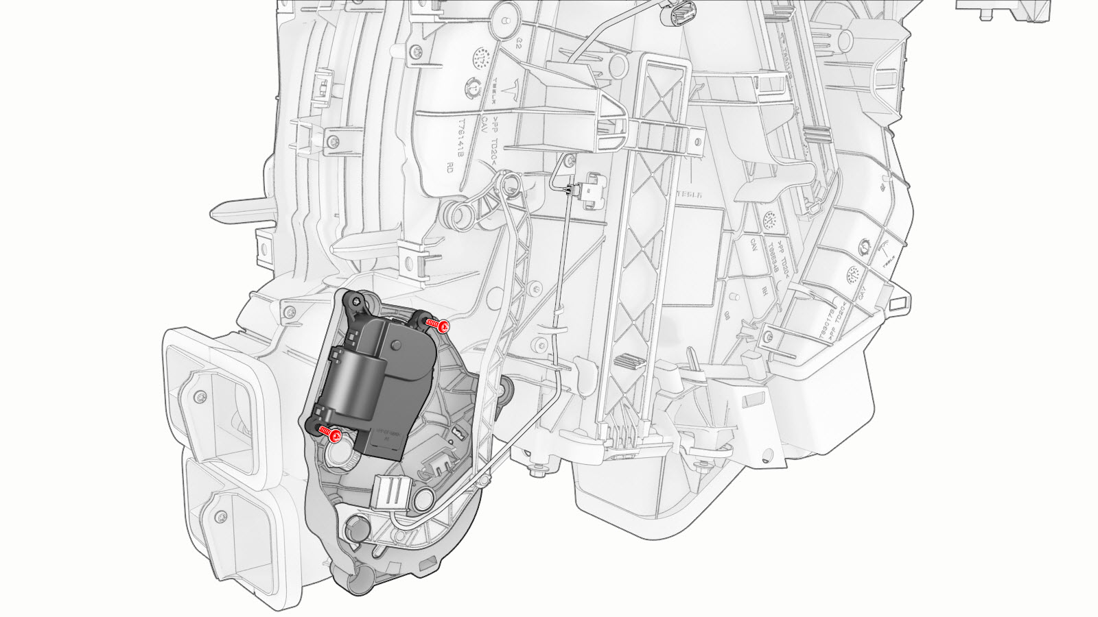 ![]() | 3 | Remove the screws that attach the lower mode actuator to the HVAC assembly, and then remove the actuator from the HVAC assembly.![]() |