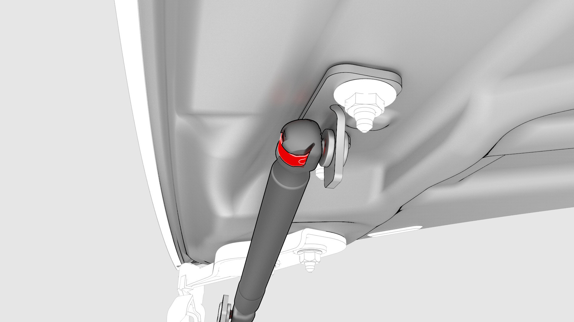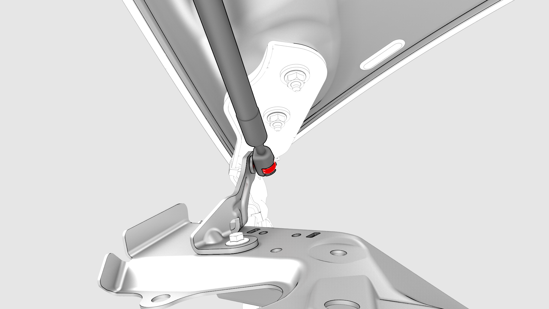 ![]() | 3 | Release the clip that attaches the hood gas strut to the hood mount. | |