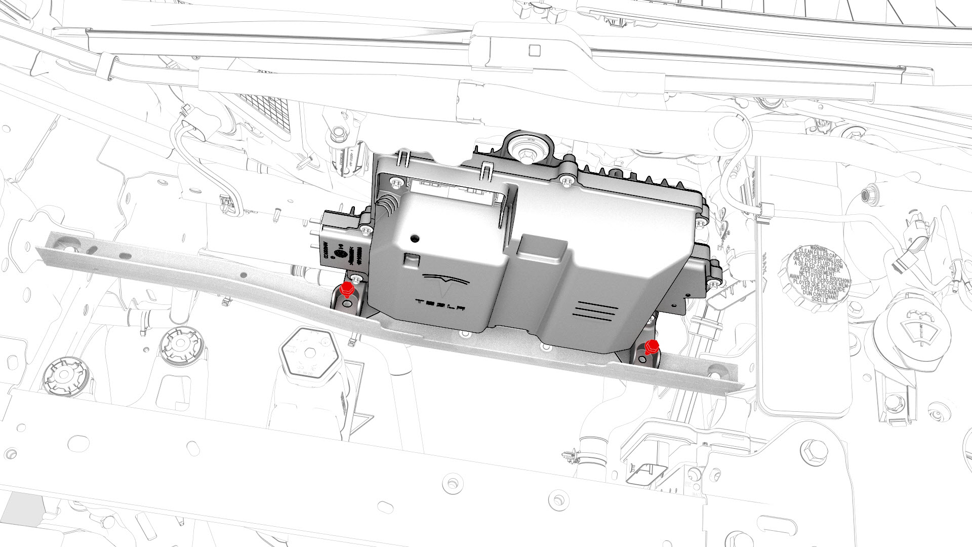 ![]() | 3 | Install the bolts that attach the front controller to the 12V battery bracket beam.![]() Torque 10 Nm | |