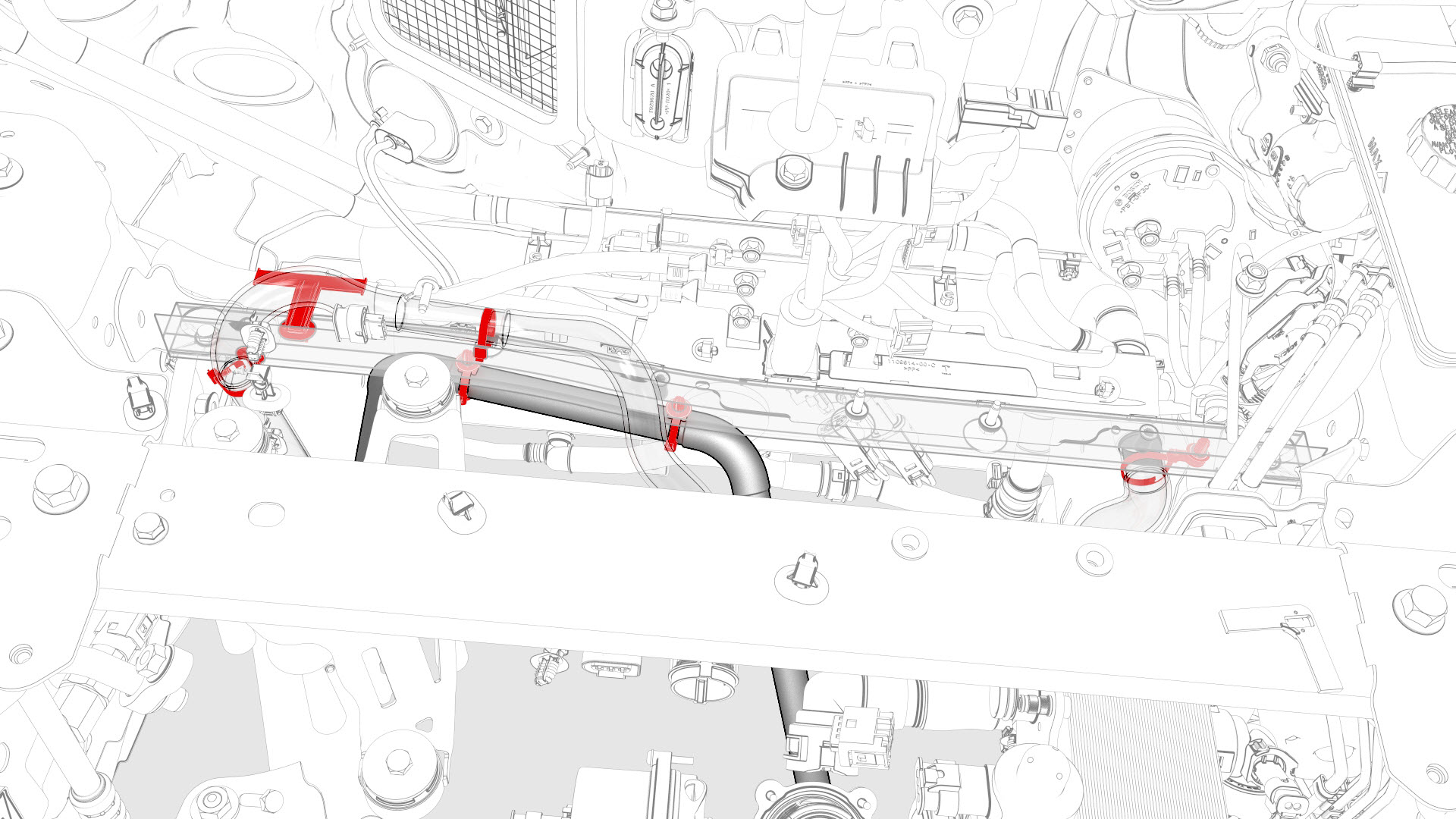 ![]() | 4 | Install the clips that attach the coolant hoses and electrical harnesses to the 12V battery bracket beam. | |