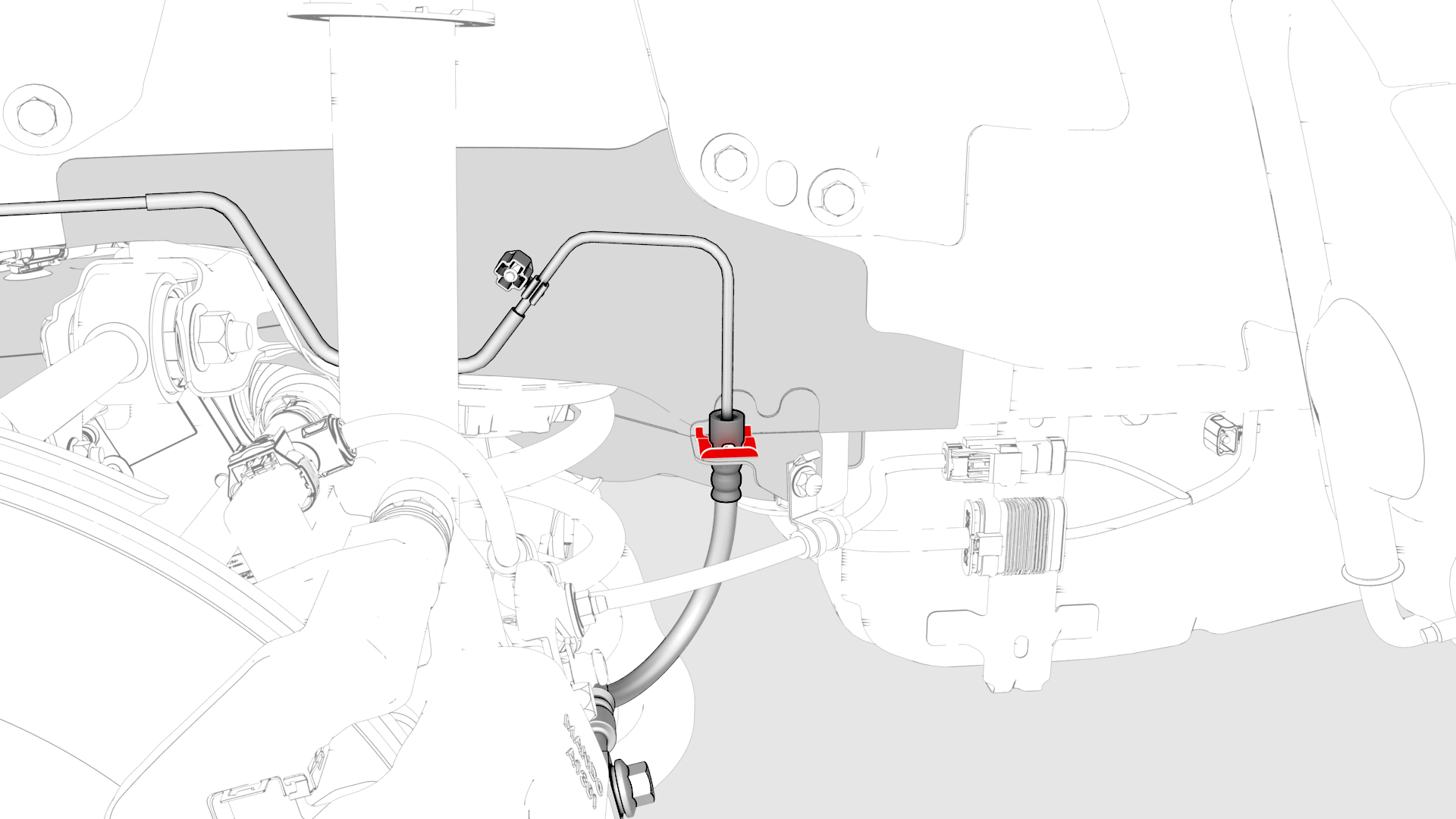 ![]() | 4 | Insert the brake line into the brake hose at the jounce hose bracket, and then use a crowfoot extension to install the brake line tube nut into the brake hose.![]() Torque 16 Nm | |