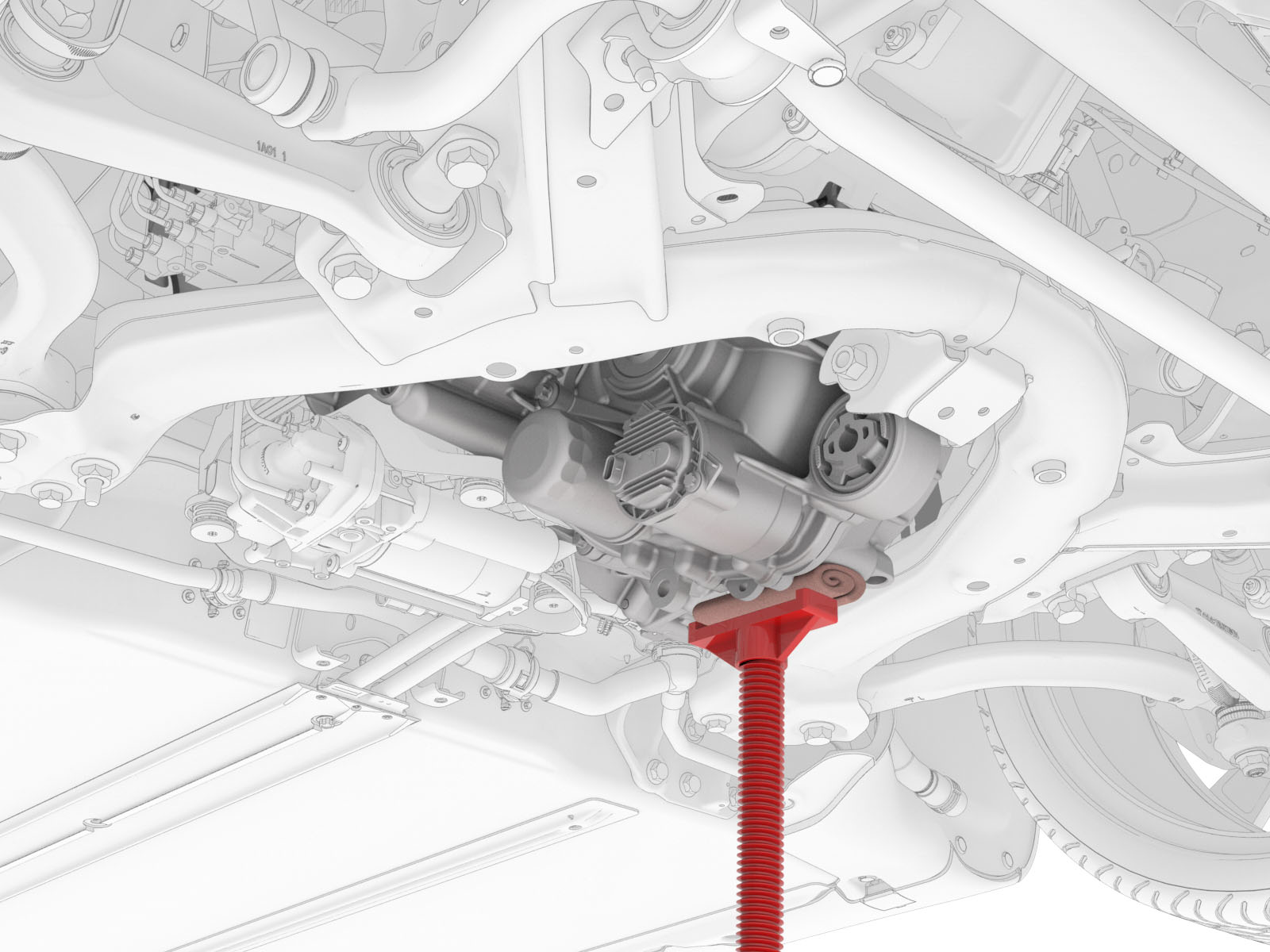 ![]() | 4 | Remove the bolt that attaches the front drive unit to the front subframe.![]() Torque 80 Nm | |