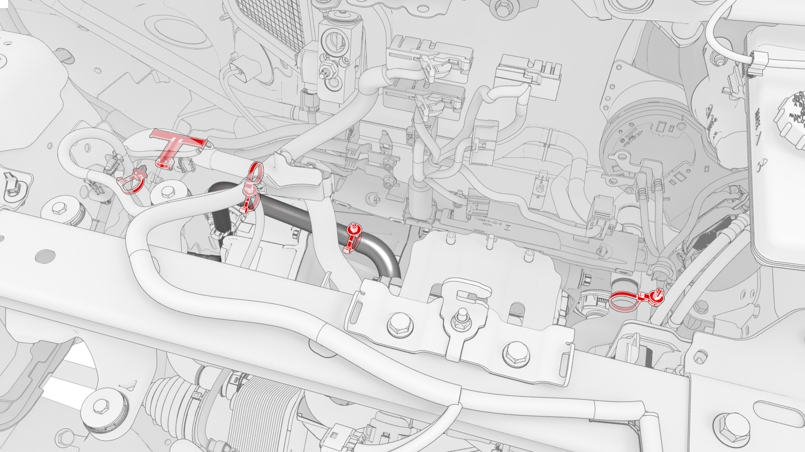 ![]() | 11 | Release the clips that attach the coolant hoses and electrical harnesses to the 12V battery beam. | |