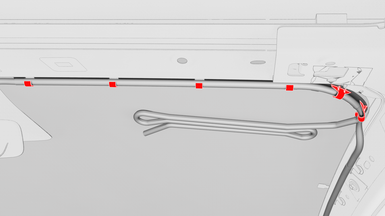 ![]() | 1 | Secure the clips that attach the windshield harness to the RH A-pillar. | |
