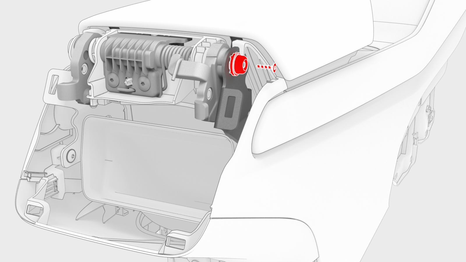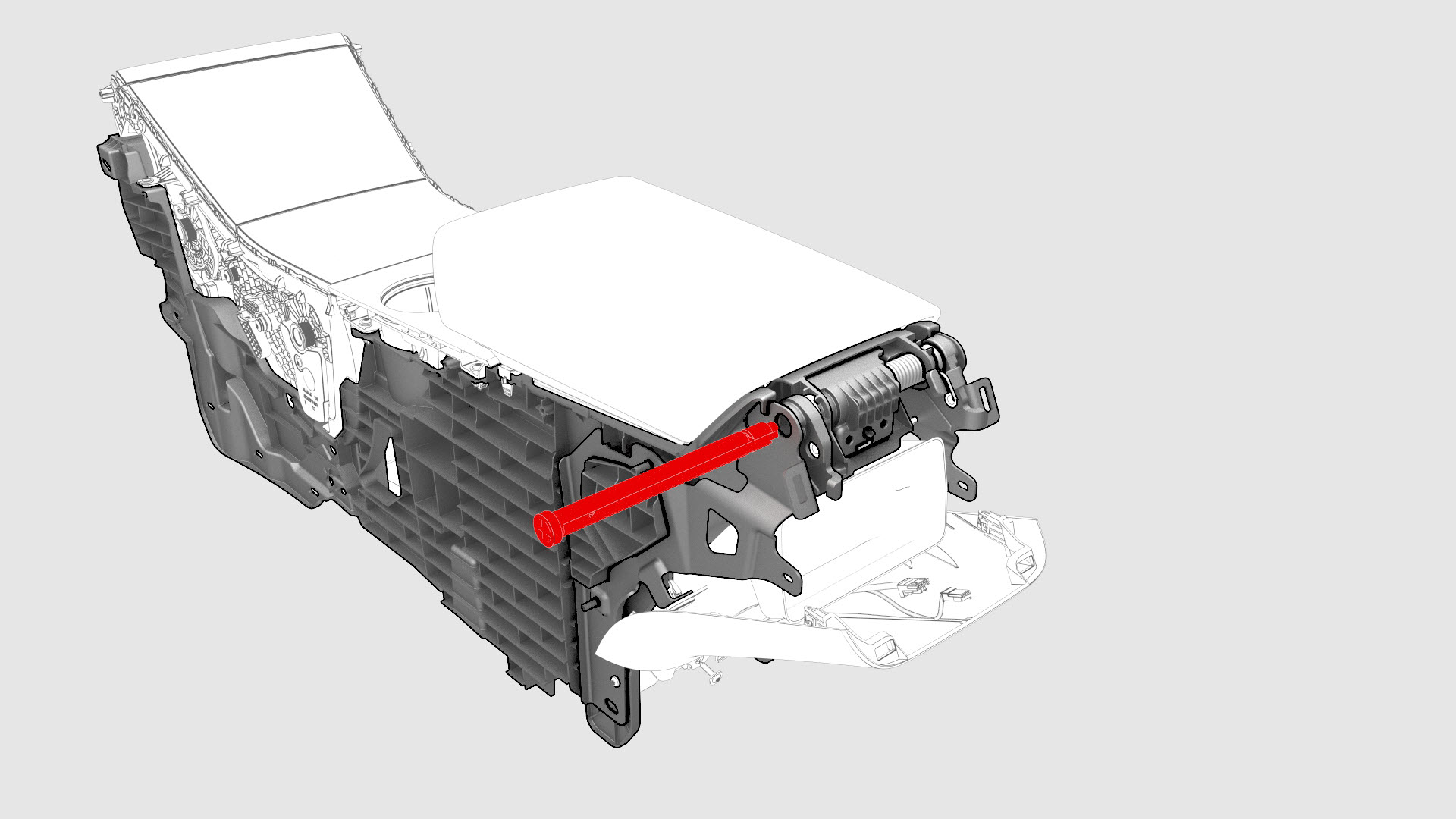 ![]() | 8 | Close the armrest, and then tap towards the LH side with a hammer and pin to remove the armrest hinge pin from the center console. Note: The armrest must be closed before proceeding.