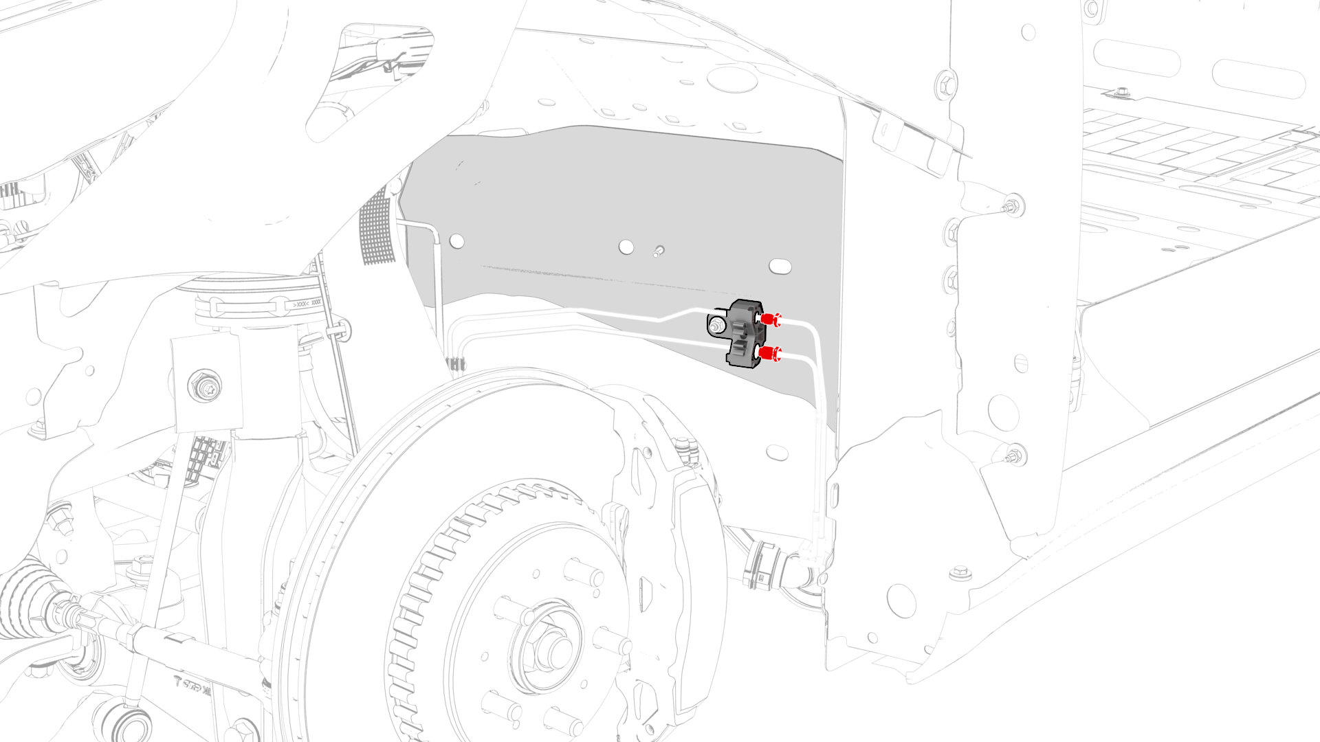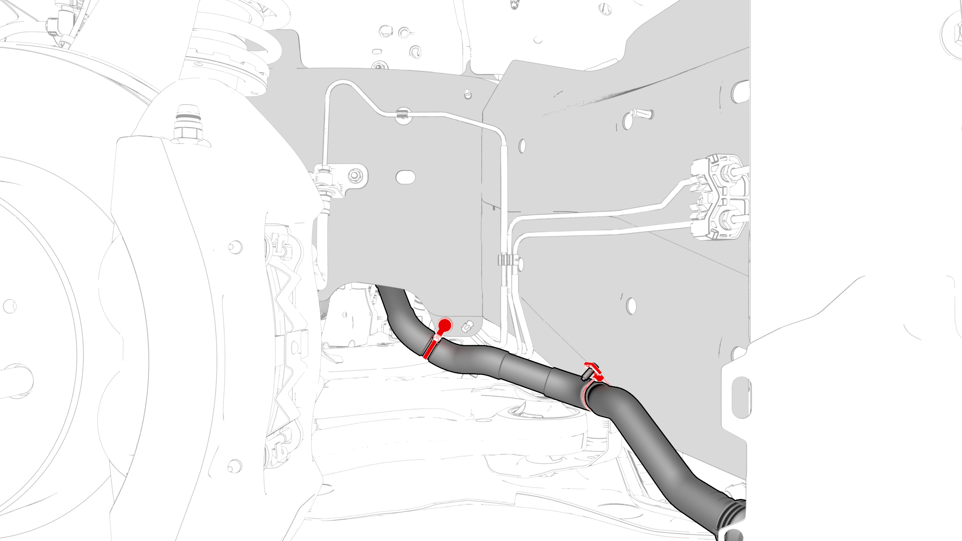 | 3 | Install the RH front brake line into the vehicle. Note: Move the RH front brake line in through the subframe from the RH side, then to the LH side, and then backward.