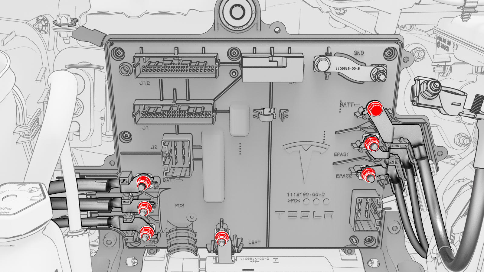 ![]() | 25 | Remove and discard the nuts (x6) and bolt that attach the power and ground cables to the front body controller module. | |