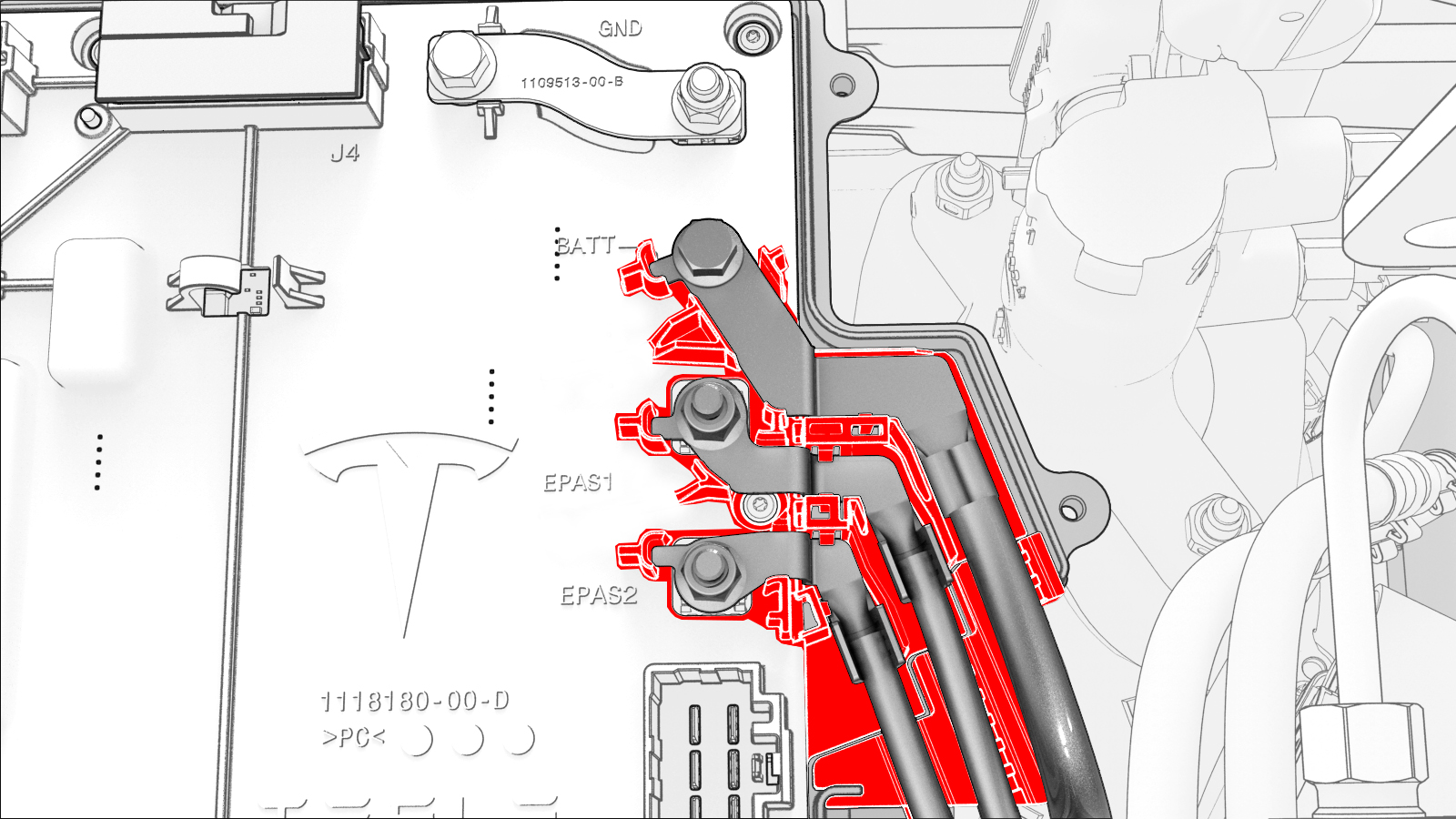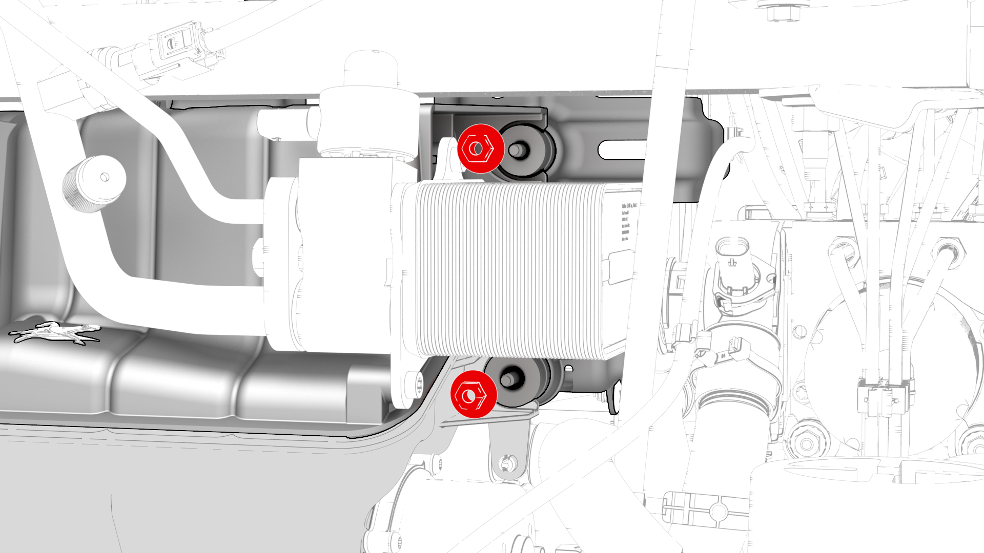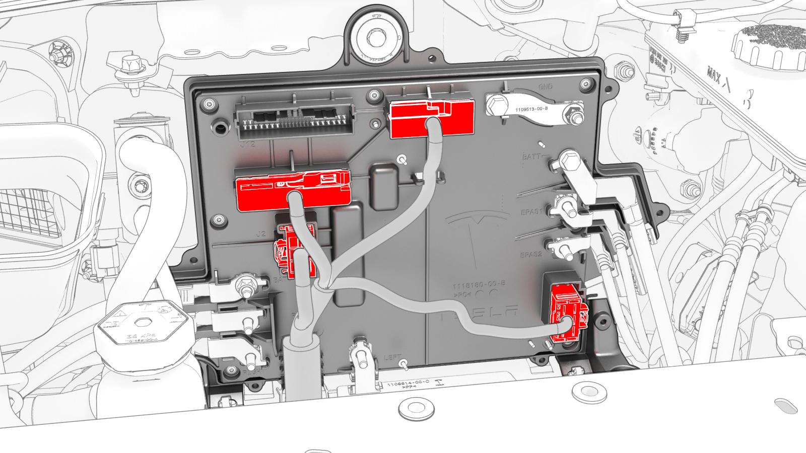 ![]() | 5 | Slide the busbar onto the lower stud, and then fasten the electrical harness clips (x2) to the bottom of the front body controller module. | |