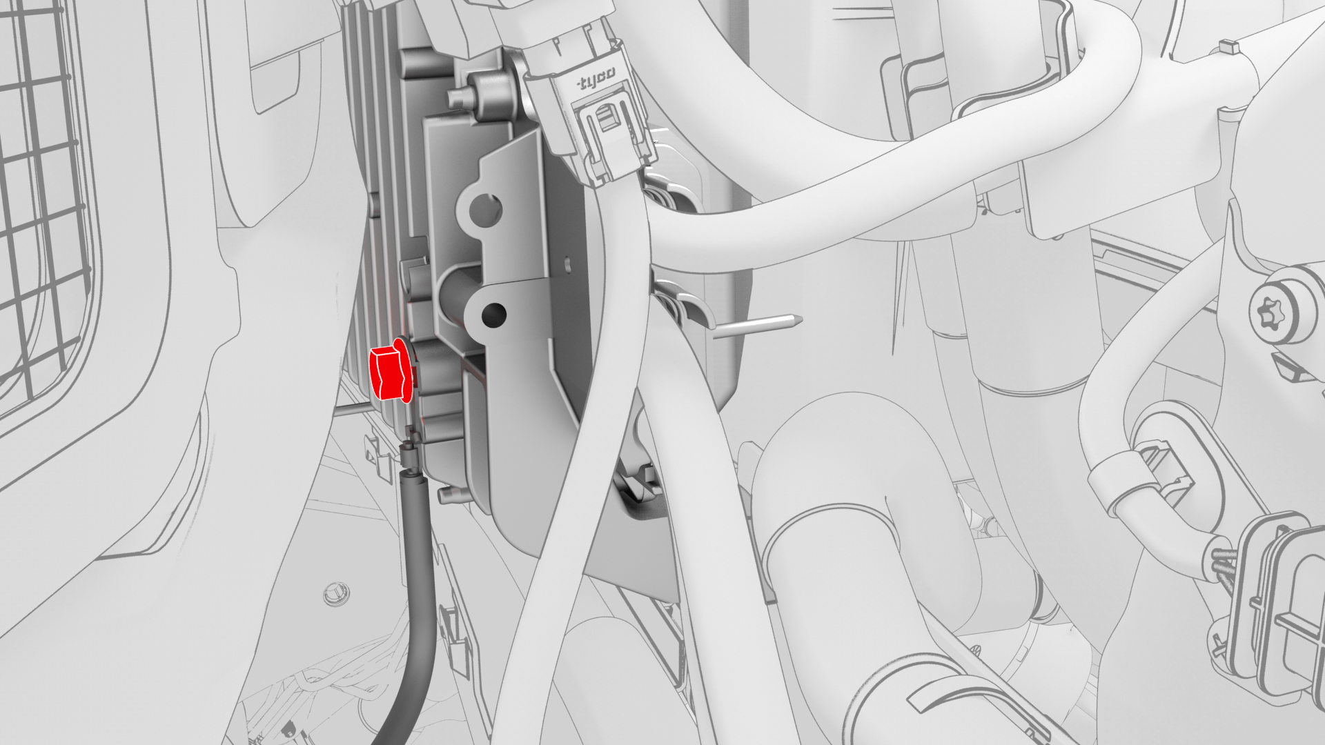 ![]() | 22 | Release the clip that attaches the suction/liquid lines to the body near the TXV, and then move the electrical harness aside to gain access to the front body controller module. | |