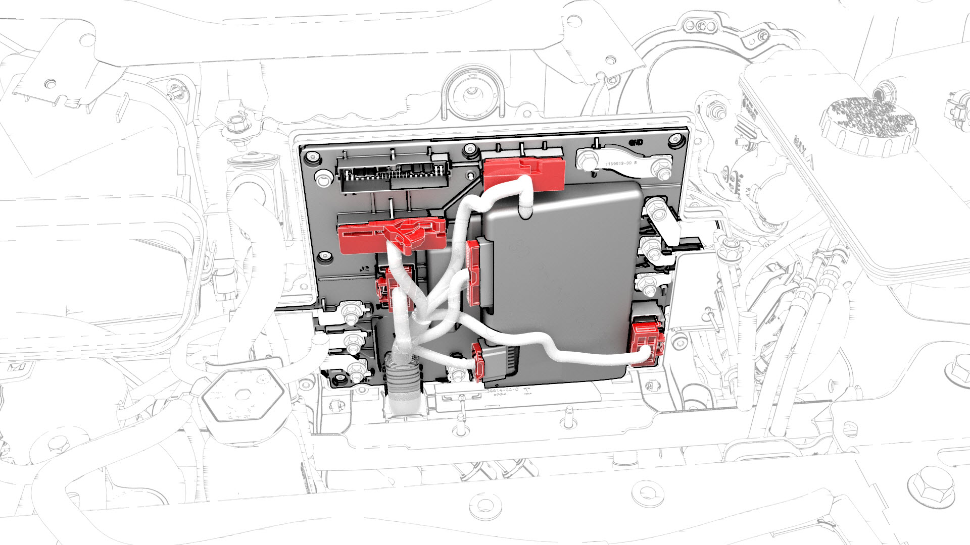 ![]() | 20 | Remove the bolt that attaches the thermal harness cover to the front body controller module, and then remove the cover from the module. | |