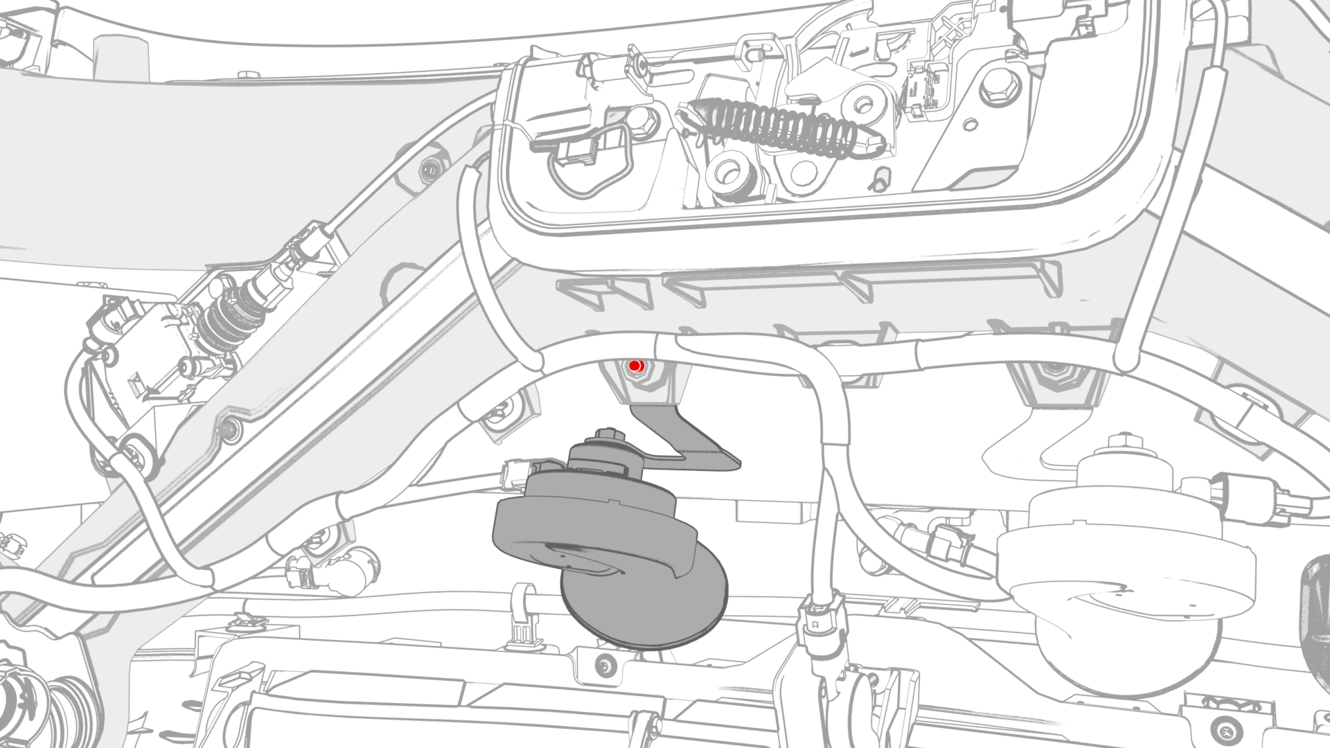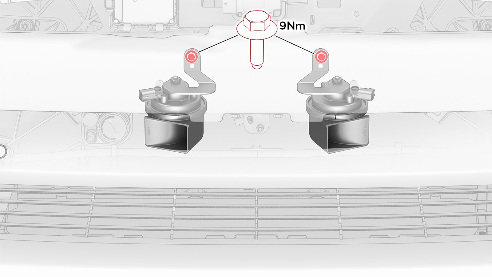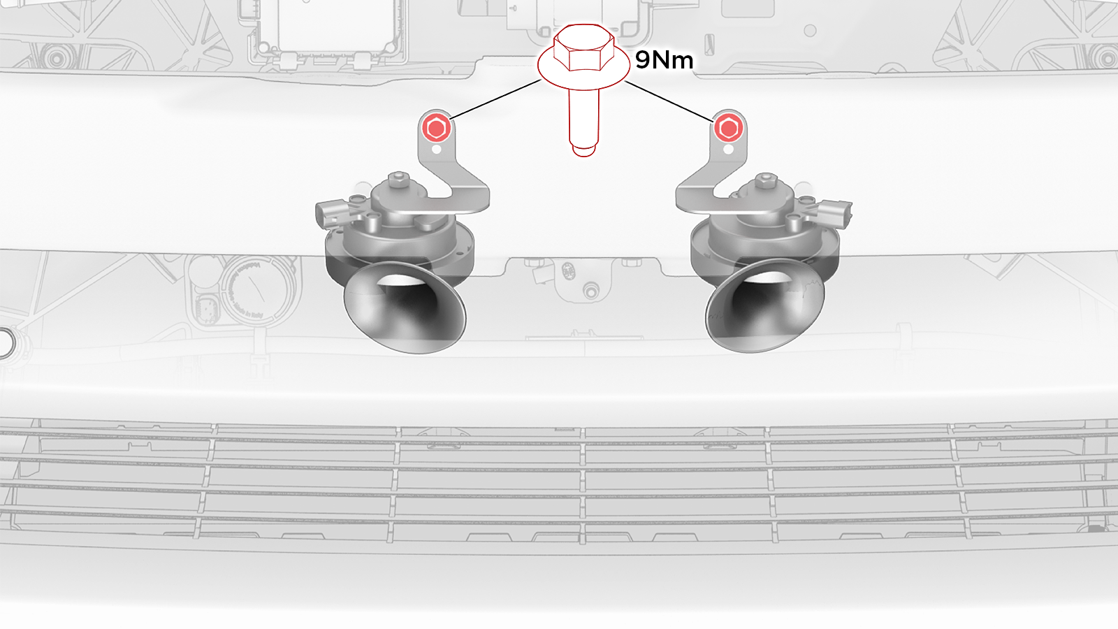 ![]() North America ![]() EMEA ![]() | 3 | Remove the bolt that attaches the horn to the carrier, and remove the horn from the vehicle.![]() Torque 9 Nm |