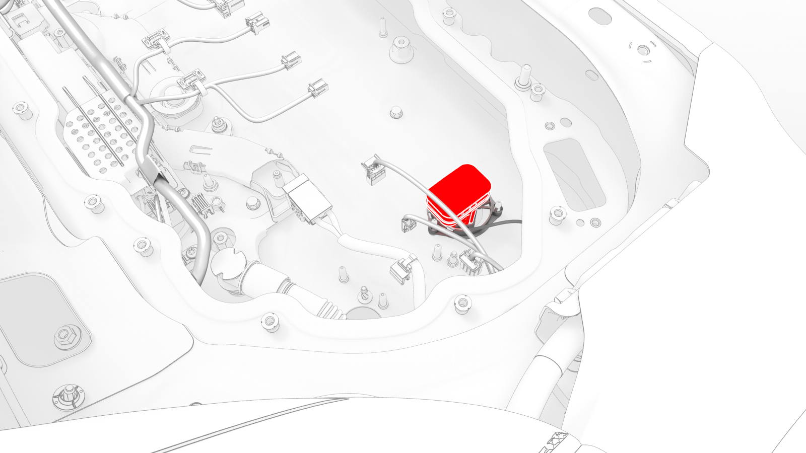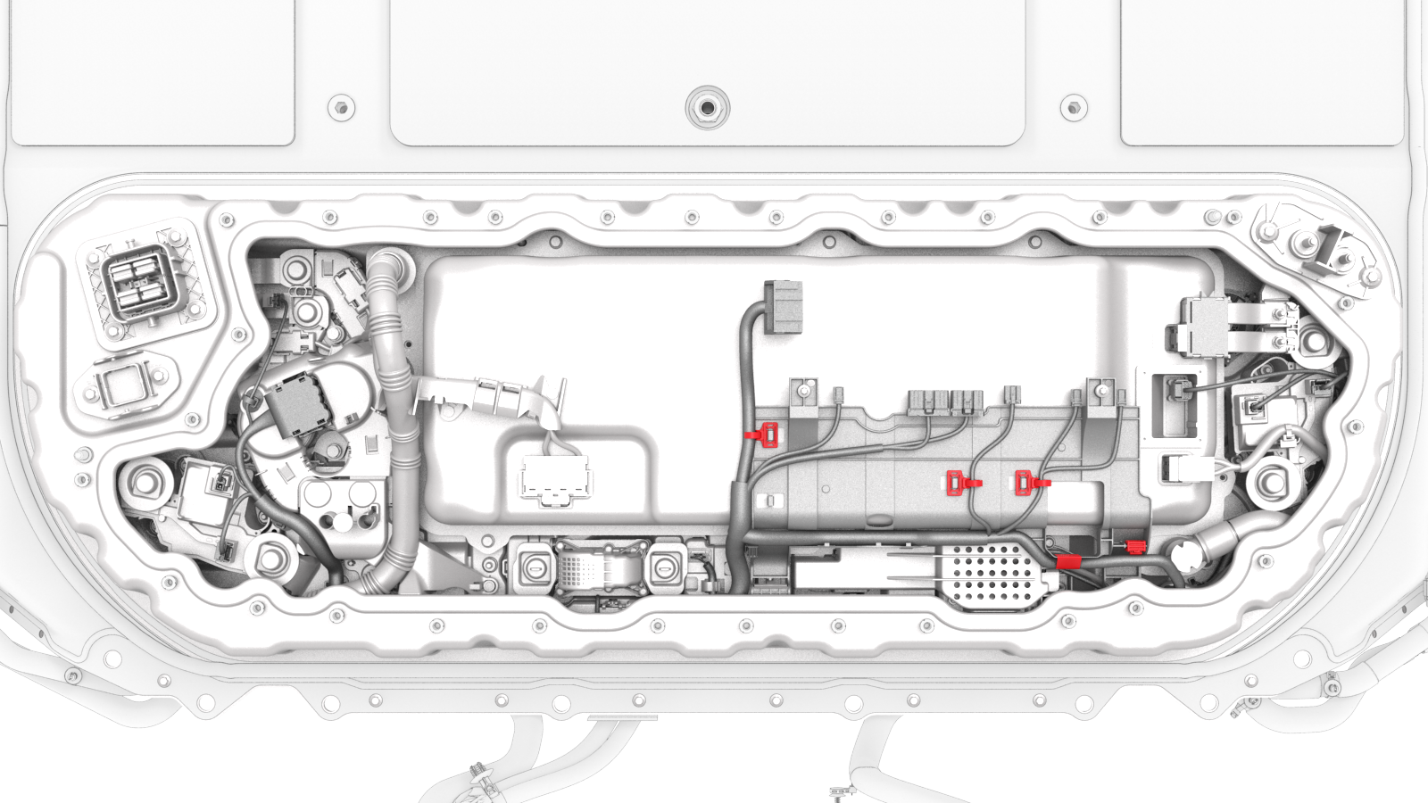 | 1 | Lay the HV battery penthouse harness down inside of the penthouse. Note: The large fast charge contactor connector goes on the LH side near the LH passthrough to the HV battery.