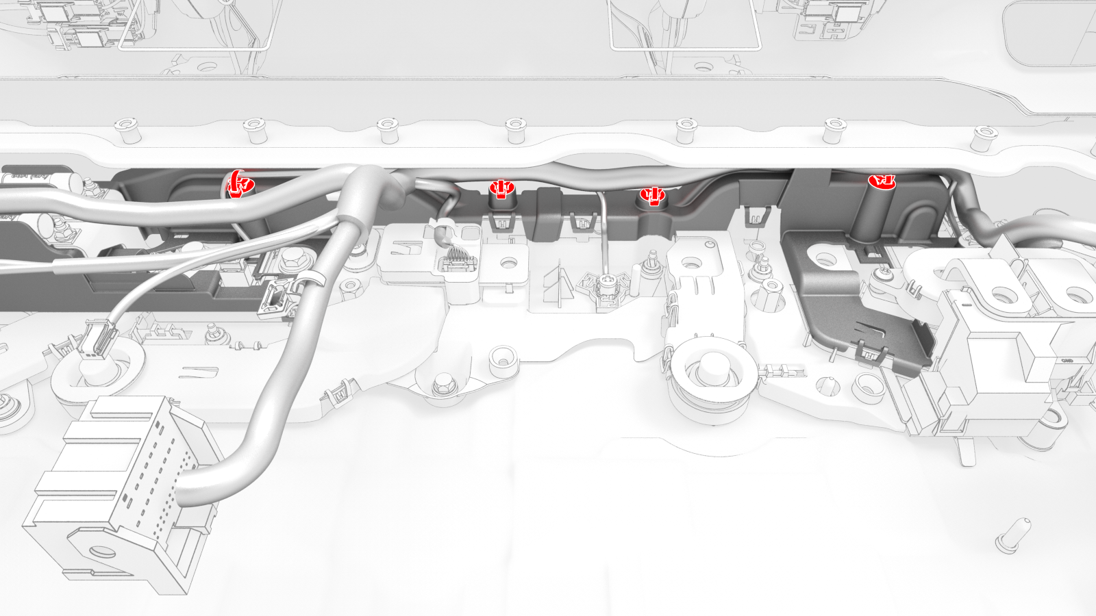 ![]() | 29 | Fasten the clips (x5) that attach the HV battery penthouse harness to the hinge tray. | |