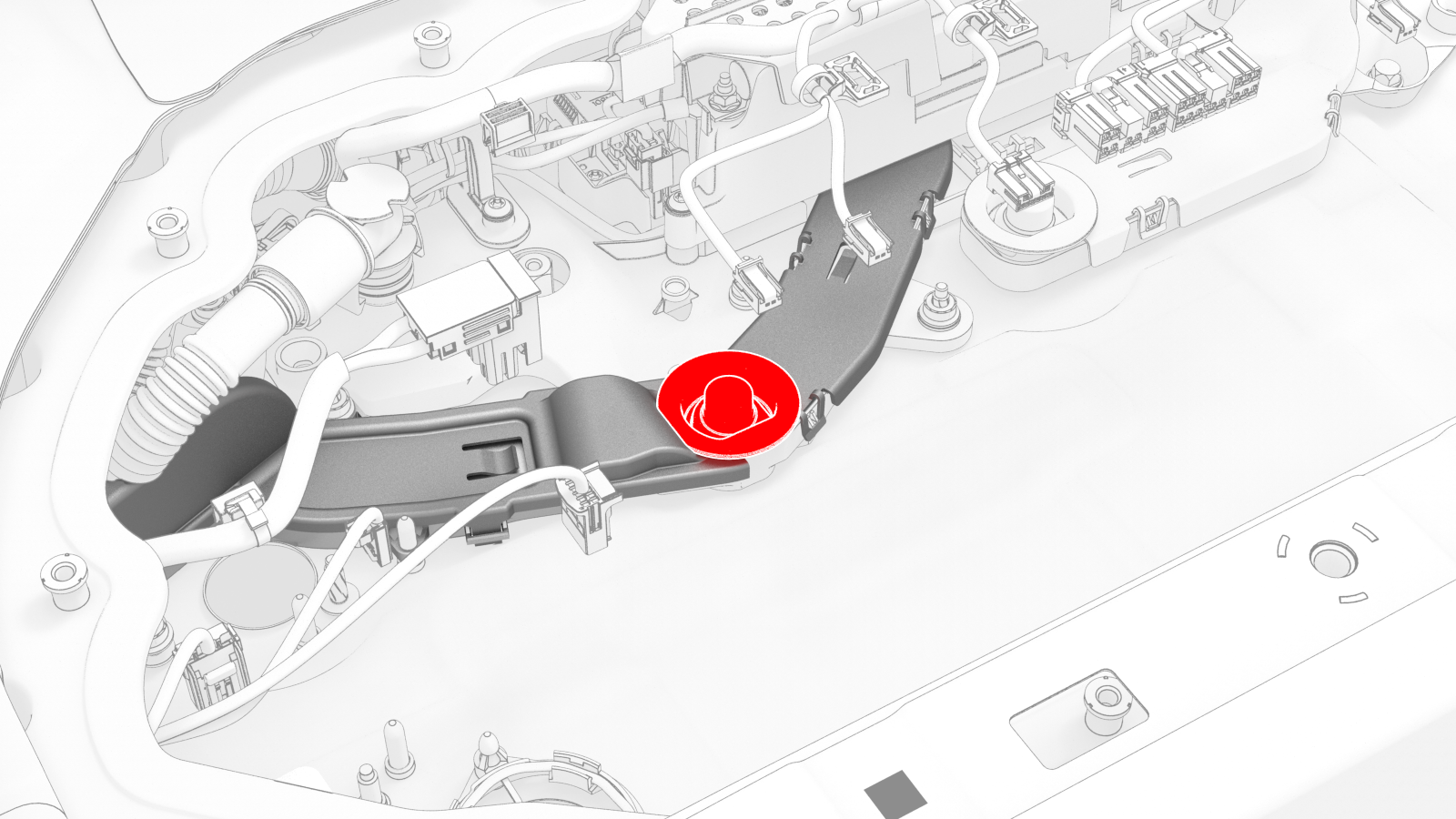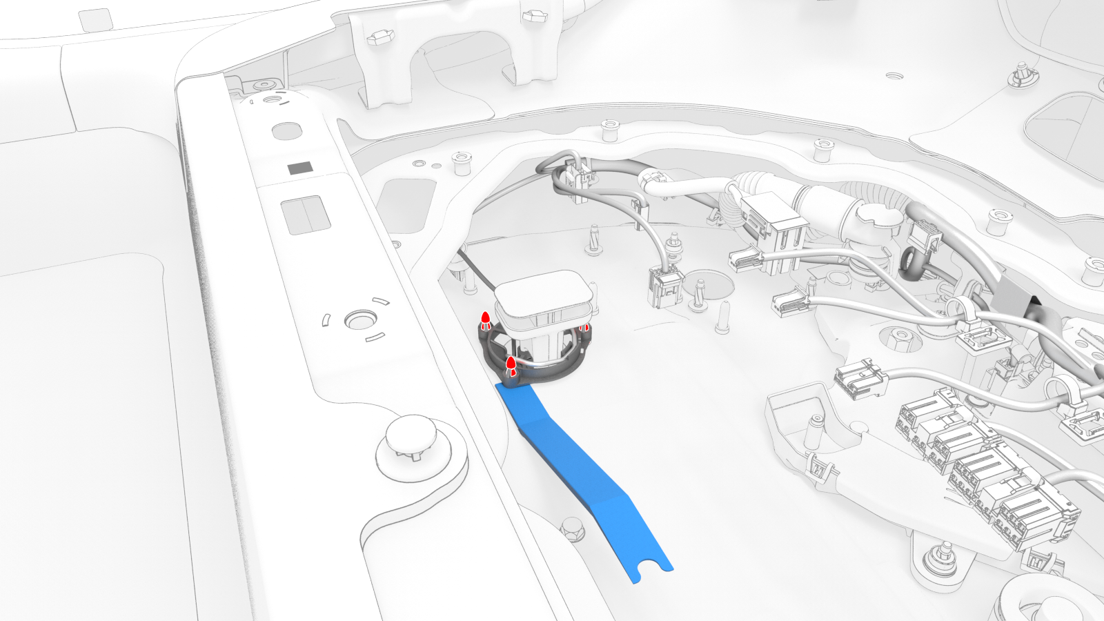 ![]() | 6 | Release the clips (x5) that attach the HV battery penthouse harness to the hinge tray. Note: Pull and unhook to release the flat rectangular clips.