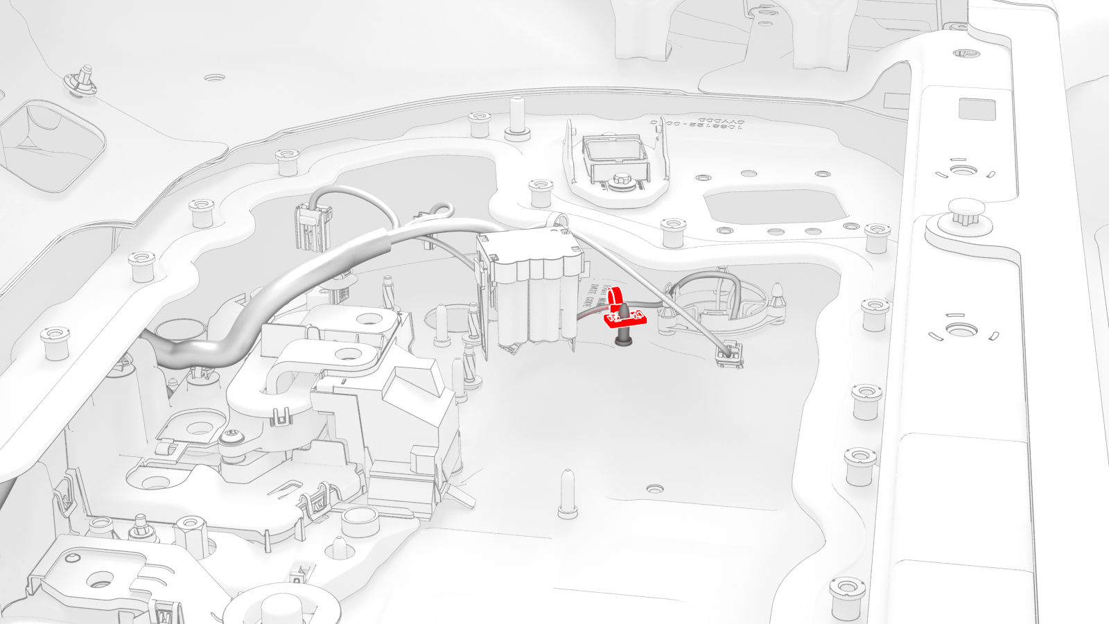![]() | 18 | Remove the nuts (x2) that attach the positive DC link to the penthouse floor, lift the link off of the studs and posts, and then move the link inboard to access the HV battery penthouse harness clips. | |