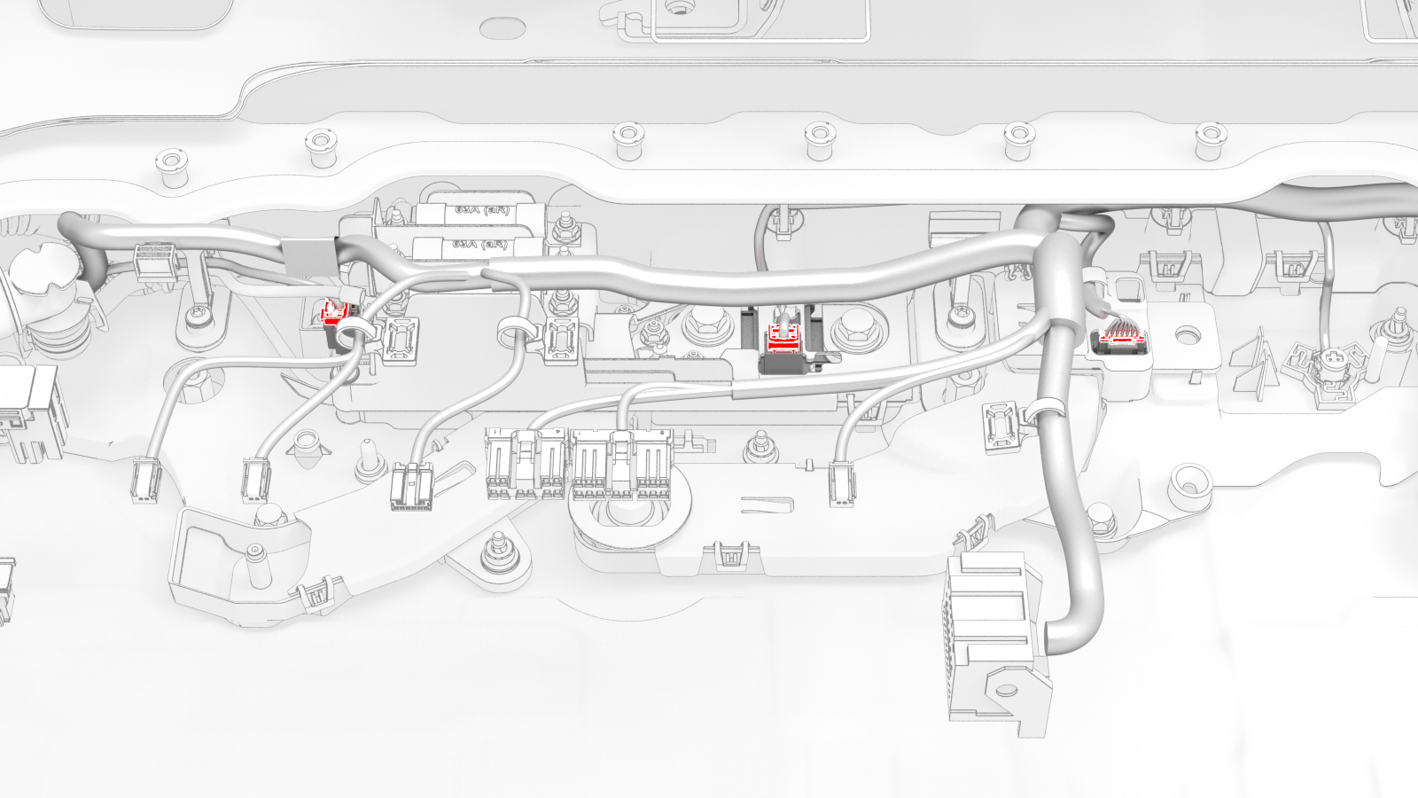 ![]() | 27 | Release the clips (x4) that attach the HV battery penthouse harness along the busbar insulator. | |