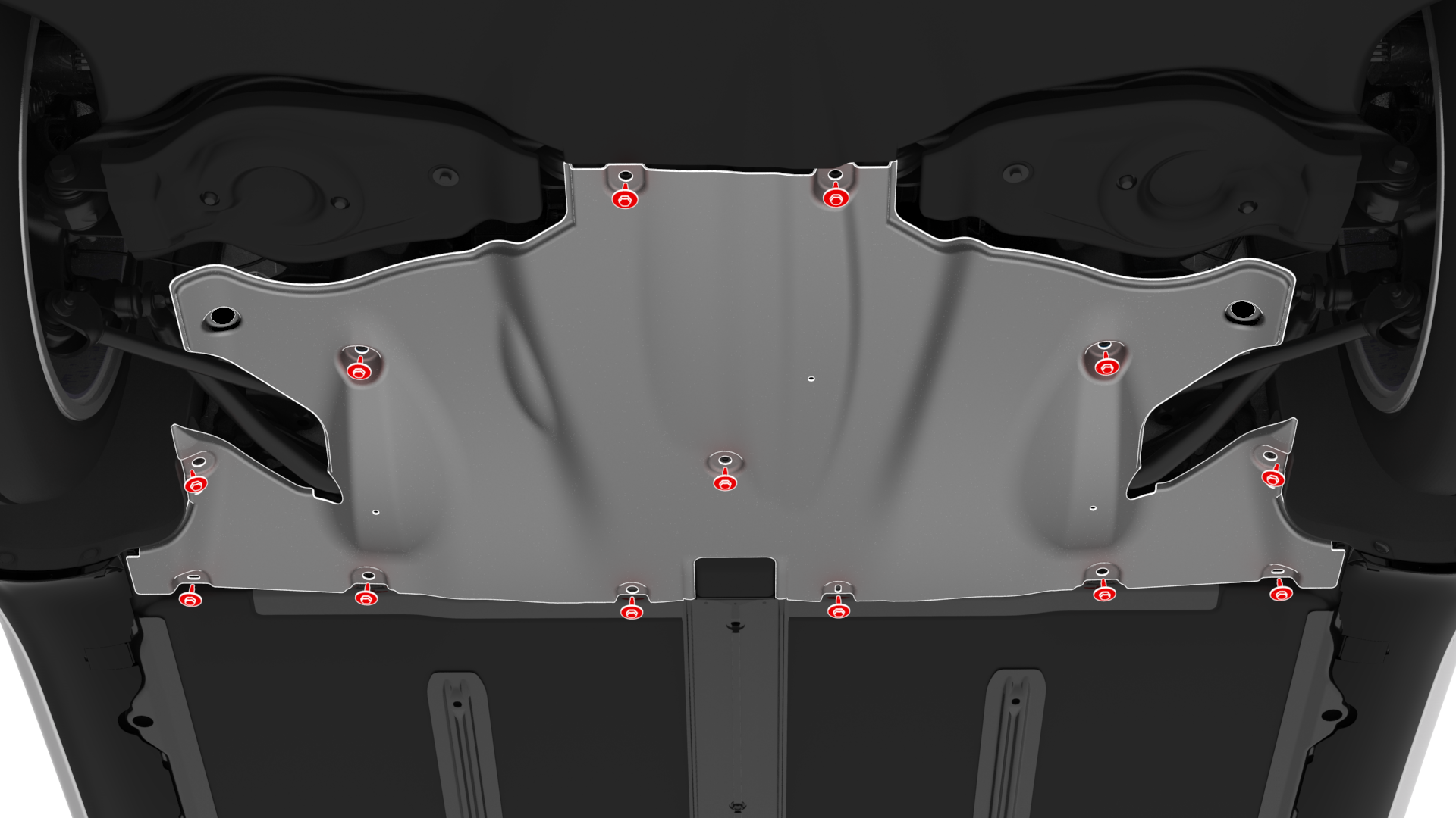 ![]() | 2 | Remove the bolts (x13) that attach the mid aero shield panel to the vehicle, and then remove the panel from the vehicle.![]() |