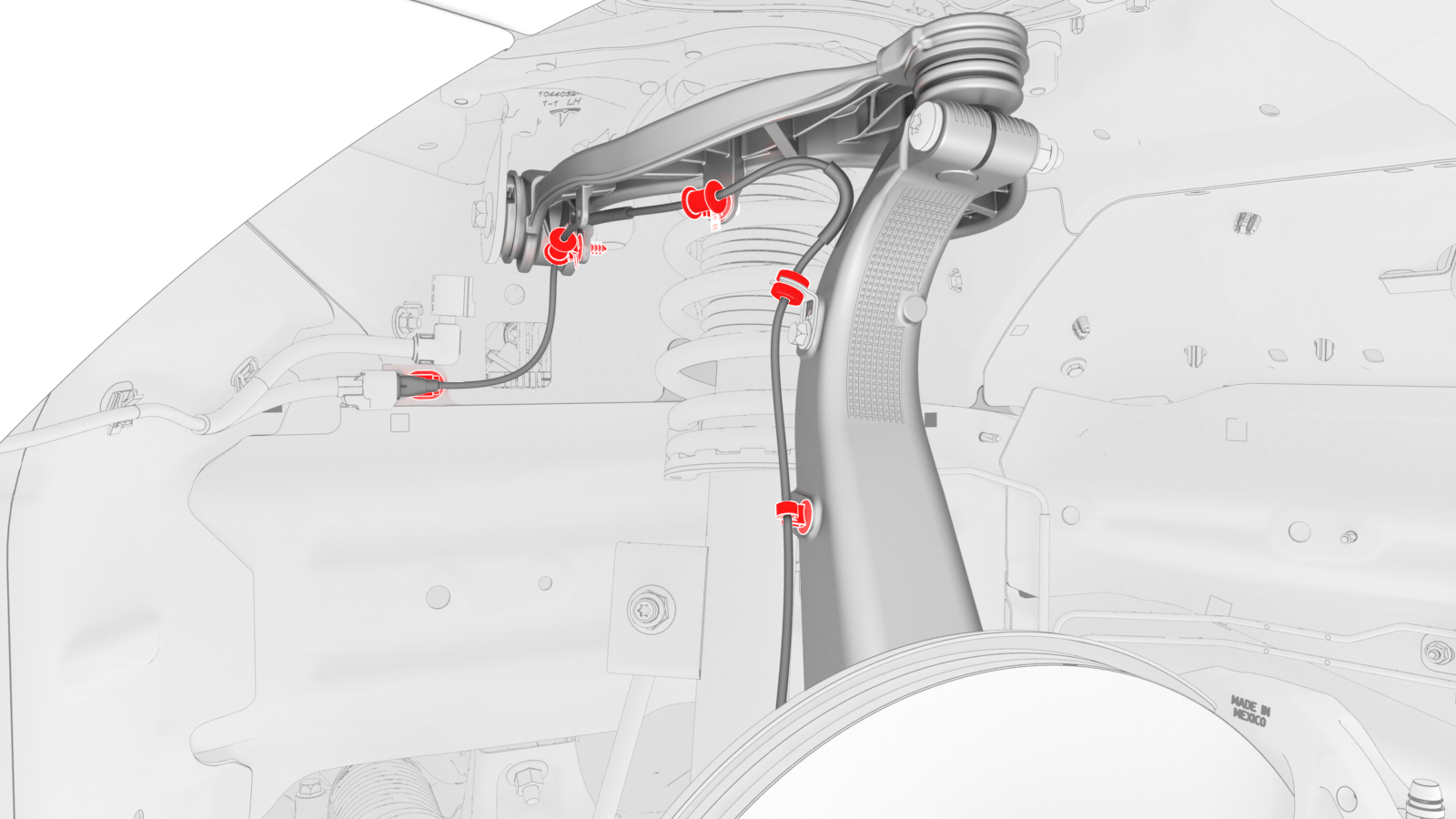 ![]() | 2 | Fasten the clips (x4) and install the grommet that attach the front LH ABS wheel speed sensor cable to the body and front LH suspension. Caution: Perform a push-pull check on each clip and the grommet to make sure they are fully attached to the body, to the upper control arm, and to the knuckle.
