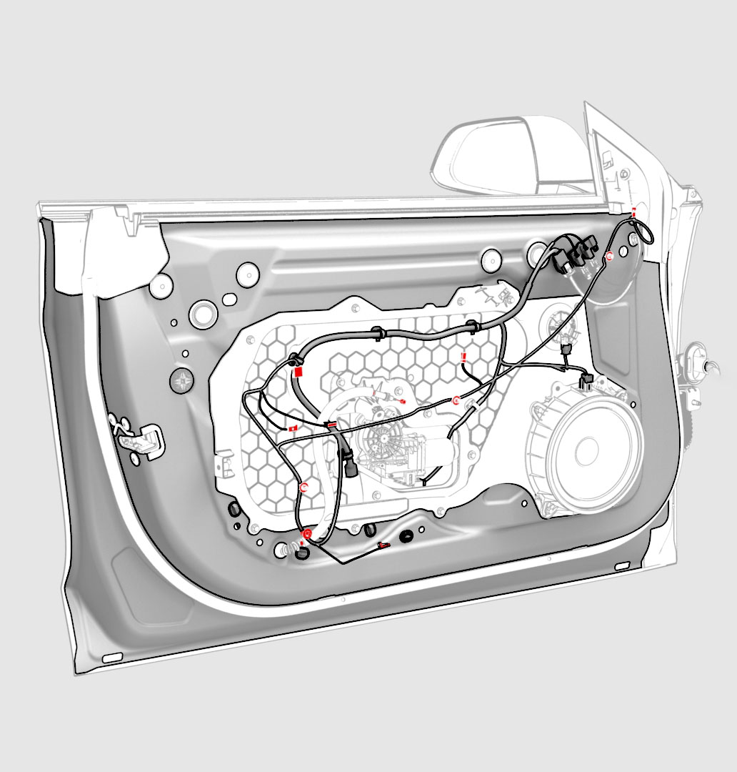 | 6 | Connect the electrical harness to the LH front door trim panel connectors. | ||