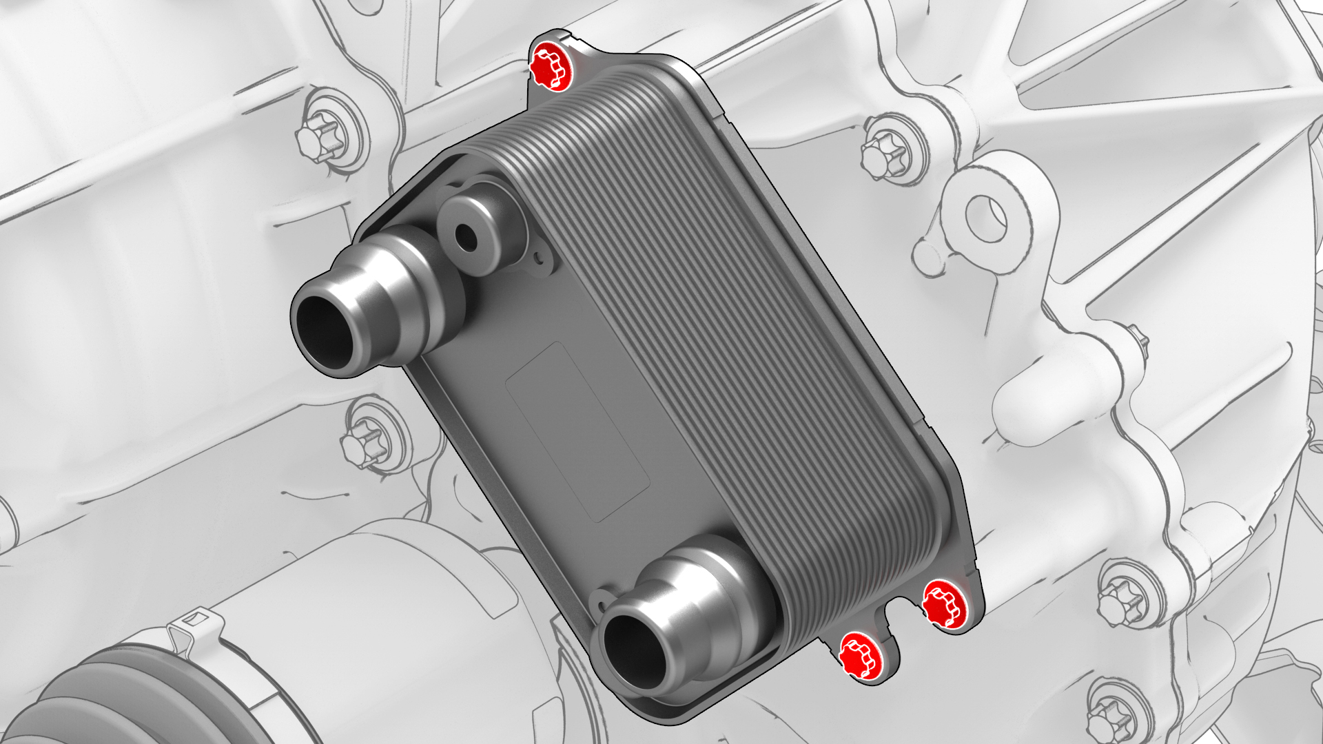 ![]() | 4 | Remove the bolts that attach the heat exchanger to the inverter.![]() Torque 5 Nm + 30 degrees Note: Place a shop towel underneath the heat exchanger to catch any escaping fluids.