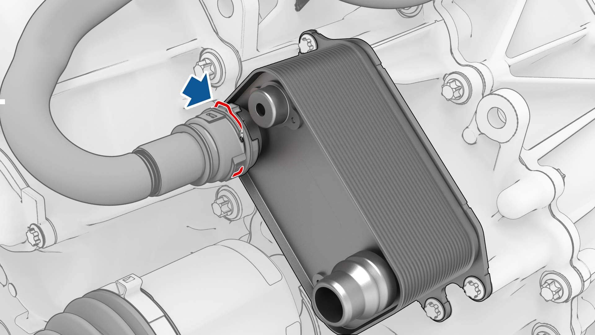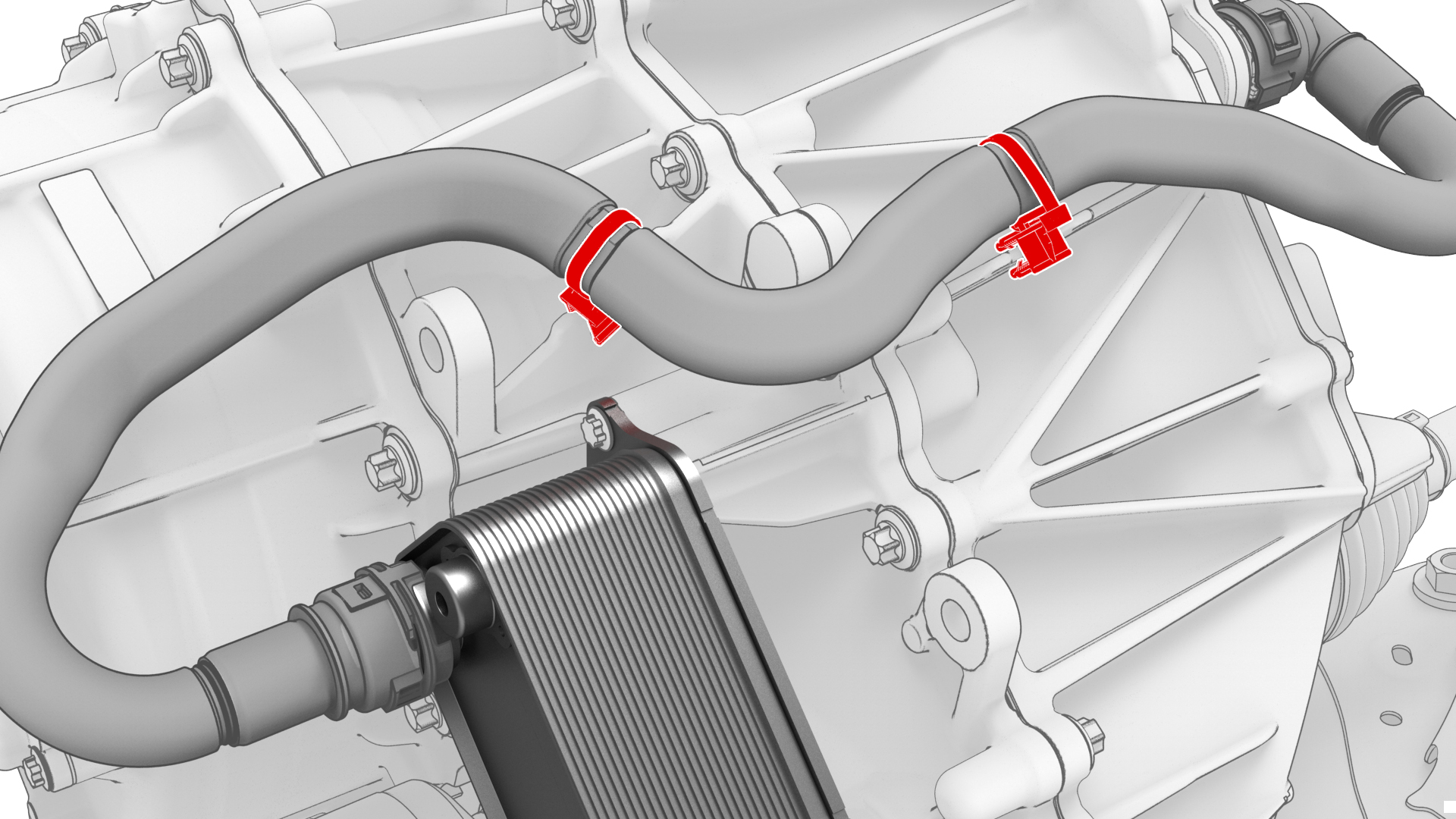 ![]() | 2 | Release the clip that connects the front drive unit inverter-heat exchanger hose to the heat exchanger coolant inlet. | |