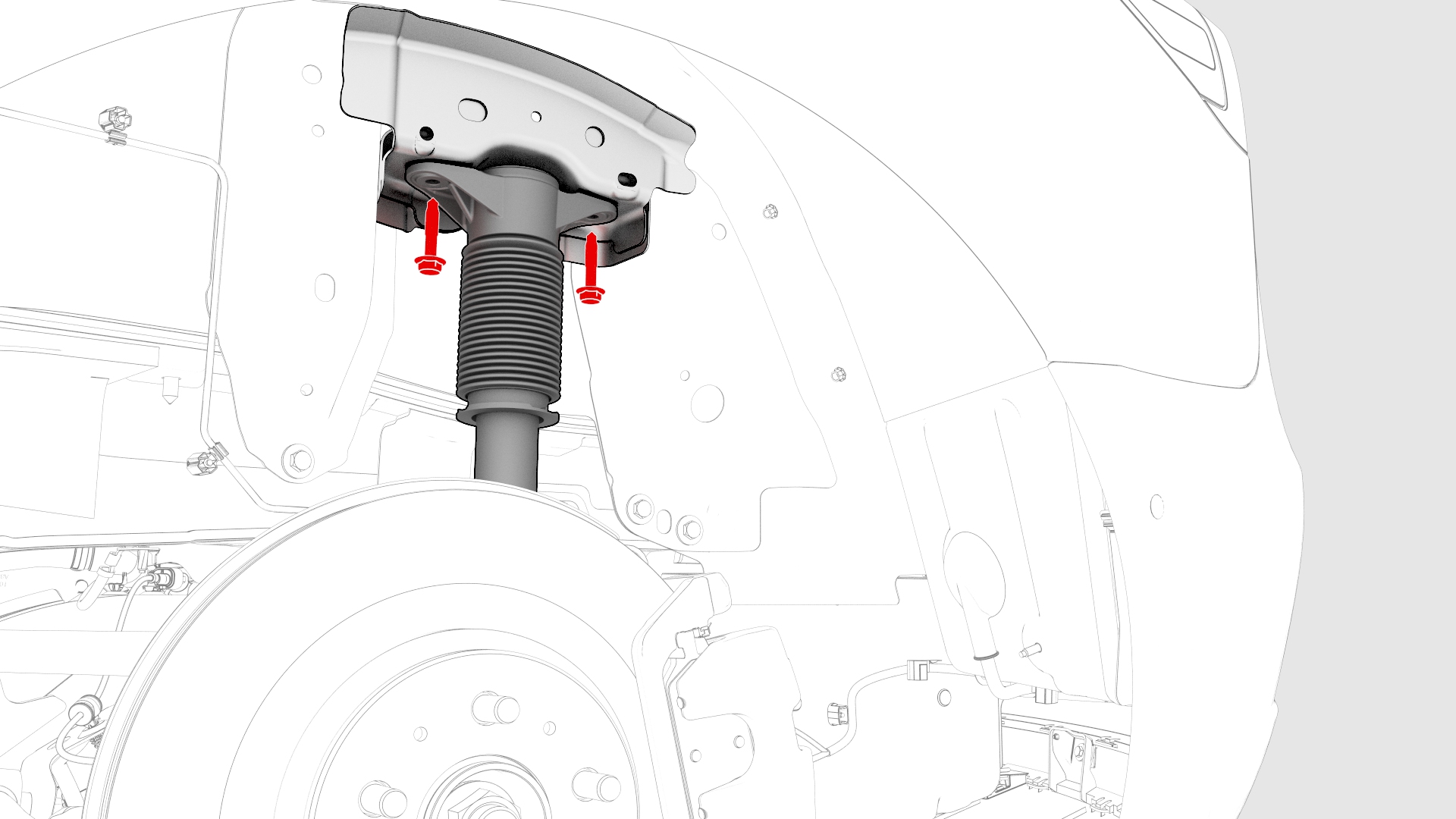 ![]() | 19 | Install a spring compressor onto the LH rear coil spring. Line up the hooks per image and verify that the spindle goes through the body opening when the suspension is compressed. | |