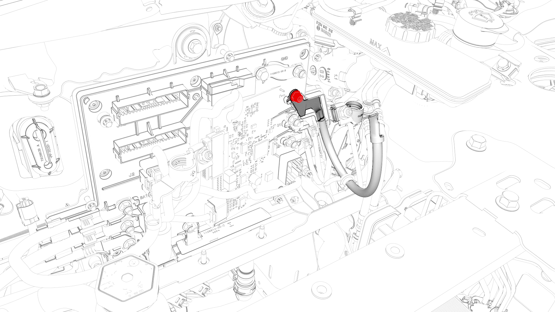 ![]() | 5 | Remove the bolt that attaches the thermal harness cover to the front body controller module, and then remove the cover from the module. | |