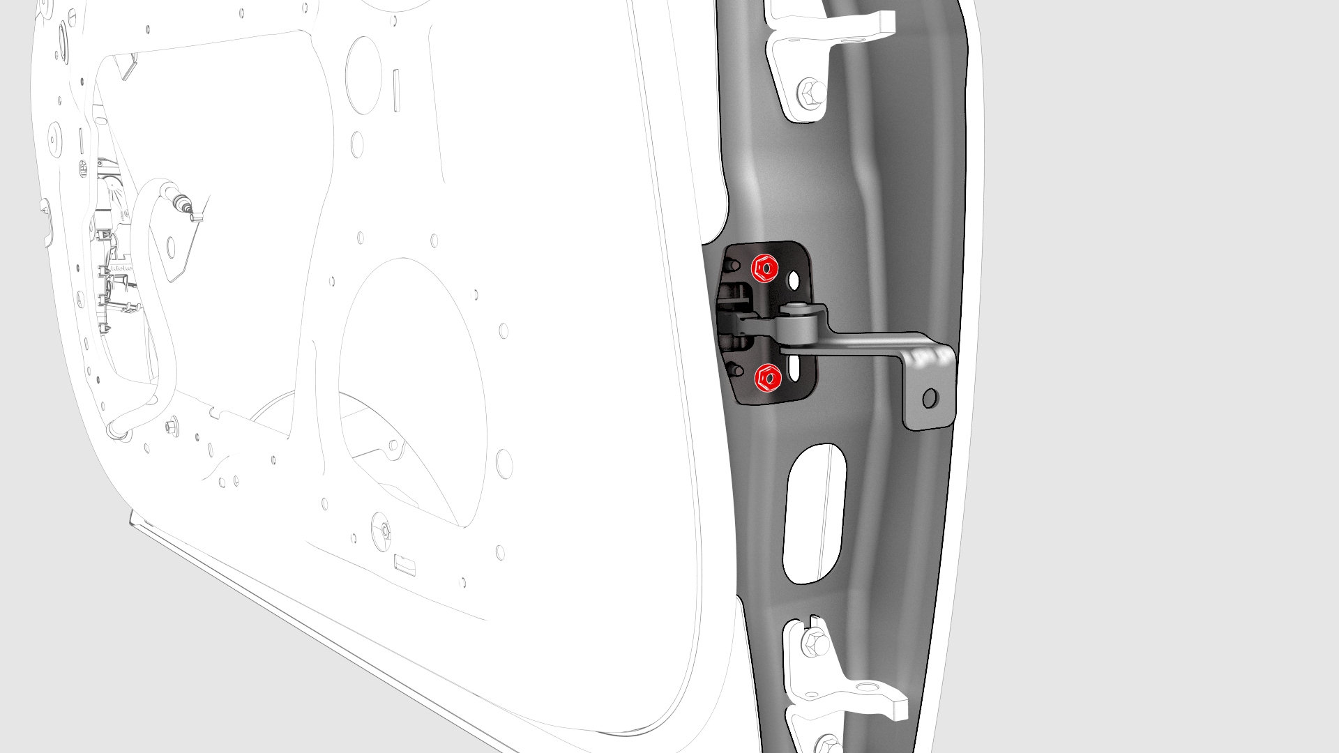 - Partially thread the upper bolt for each hinge in the door so that the door can set on the hinges to install the lower bolt.