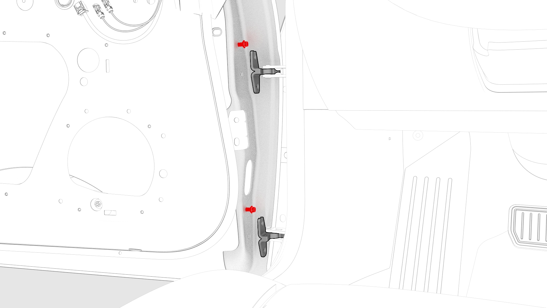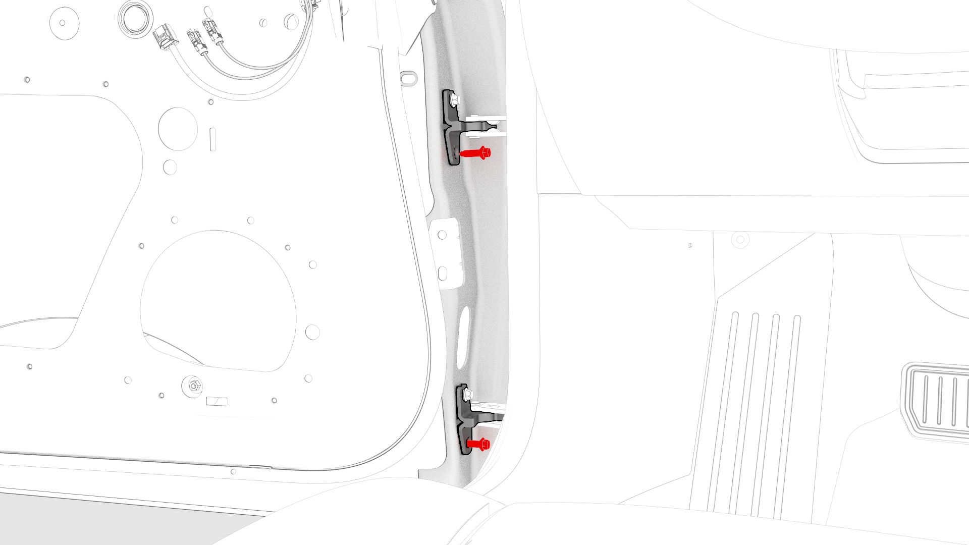 ![]() ![]() | 13 | Push the door wiring harness through the A-pillar bulkhead. | |